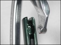 | 1980年代、フリークライミングの技術は大幅に向上し難度の高いルートが数多く誕生しました。それらのルートでは素速いロープクリッピングが求められ、クリッピング動作そのものが難しいルートも現れて来ました。そのような状況の中、ロープクリッピング性能を追求して生まれたのがベントゲートです。ゲートをくの字に曲げることでロープクリップを容易にし、ゲートオープン間隔も広がりました(写真2.中)。クリップしやすい反面、ロープを通す向きを間違えると、ロープの動きでゲートが開いて外れてしまう、という危険性も秘めています。ベントゲートはロープクリップ側に用いるのが原則です。 |