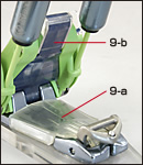 3.アンチスノープレートに接触するトープレートの下側は、船底のように中心が盛り上がっていて、足を踏み下ろした時に雪を除雪する効果がある。(写真9-b) |