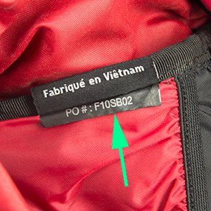 製造日コードはパック内上部の背面側に縫い付けられている黒いラベルに印刷されています。黒いラベルは複数枚重ねて縫われている場合もあります。