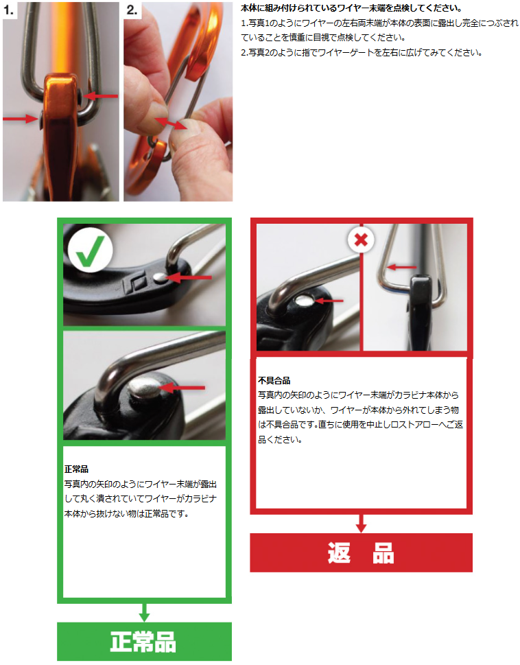 2.ワイヤーゲートカラビナ:ワイヤーゲートと本体の接続部が適切に組み付けられていること