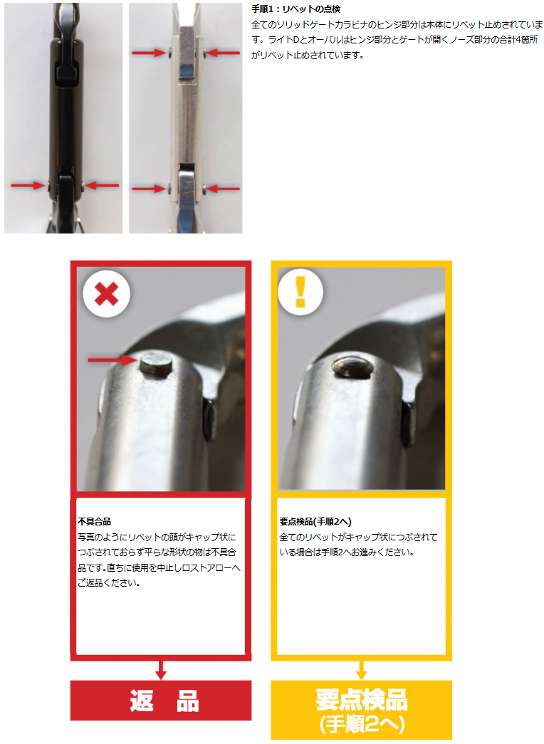 1.ソリッドゲートカラビナ(ゲートが筒状の物):上下2箇所のリベット(キーロックゲートは1箇所)が適切に打たれていること