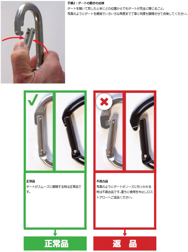 該当製造番号のカラビナとクイックドローをお持ちのお客様は後述の手順に従って製品の点検をお願いいたします。該当製品をお持ちの場合は直ちに製品のご使用を中止し、ブラックダイヤモンド日本代理店、株式会社ロストアローへ返品をお願いいたします。至急、正常な製品と交換いたします。