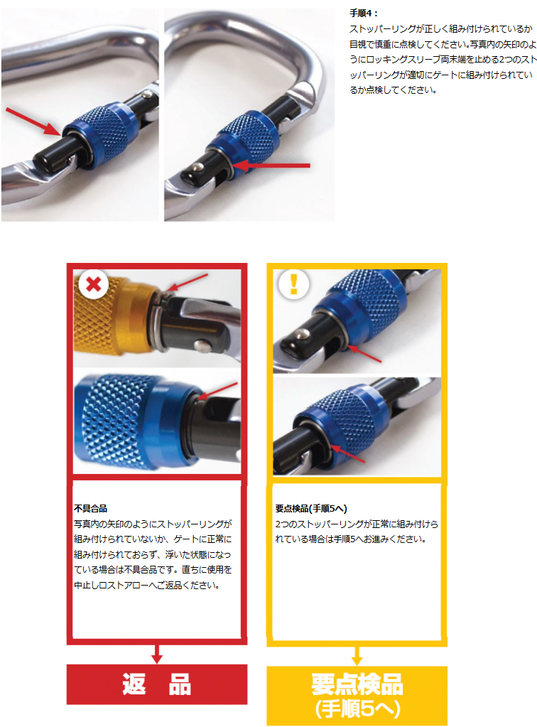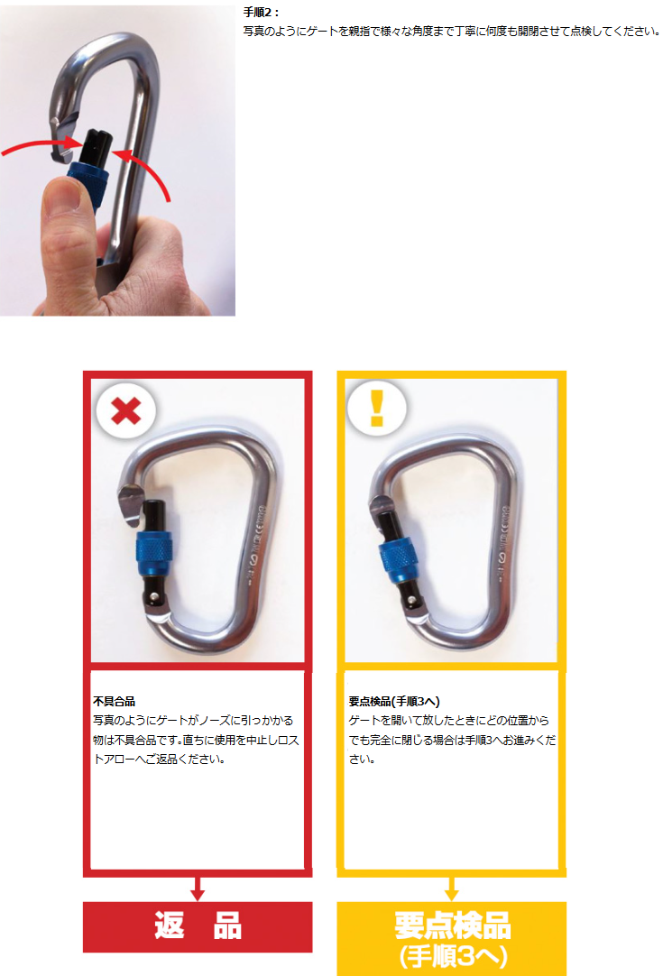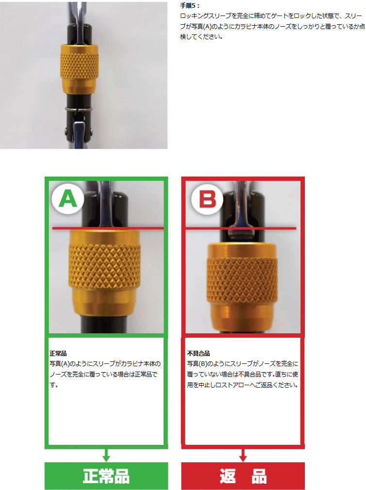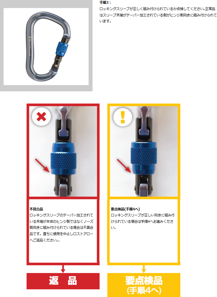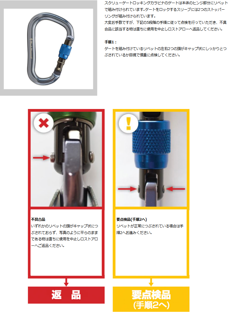また、スクリューゲートカラビナの一部にロッキングスリーブが正しく取り付けられていない製品があり、完全にはロックされない可能性があります。