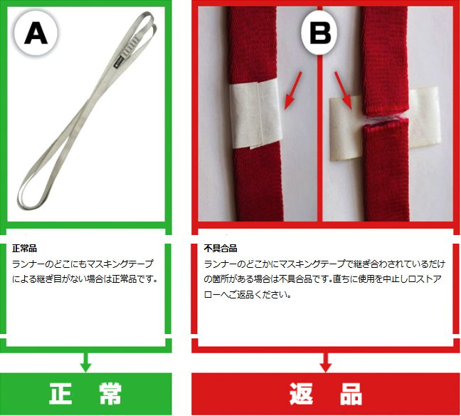 リコールの対象となる製品は18mmナイロンランナー60cmと120cmで、製品に縫い付けられているタグに製造番号2014または2015の表記がある製品です。
