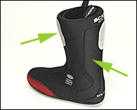 イントゥイションインナーは、内側だけを柔らかくして成形するため、インナー本体に剛性のある素材を使用することができます。特に、すね回りとアキレス腱から脹脛部分には固い素材を使用した補強を施すことで(写真3)インナー自体がねじれにくくなり、パワー伝達性能が高まります。これによりレスポンスの速いスキー操作が可能になります。