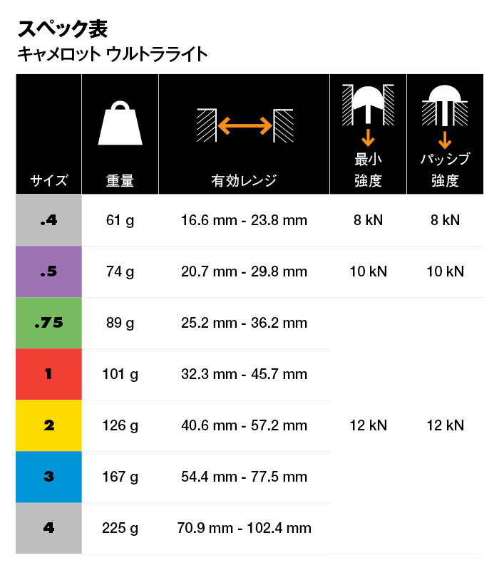 キャメロットC4をベースに徹底的な軽量化を施したキャメロットウルトラライト。ダイニーマ®コアステム、大胆な肉抜きが施されたスカルプテッド・カムローブなど、BDの最新テクノロジーから生まれた新世代のカミングディバイスです。各サイズのサイズレンジはキャメロットC4と共通。高難度トラッド、ビッグウォール、ミックスクライミング等、軽量化が成否に直結するクライミングに必携です。
