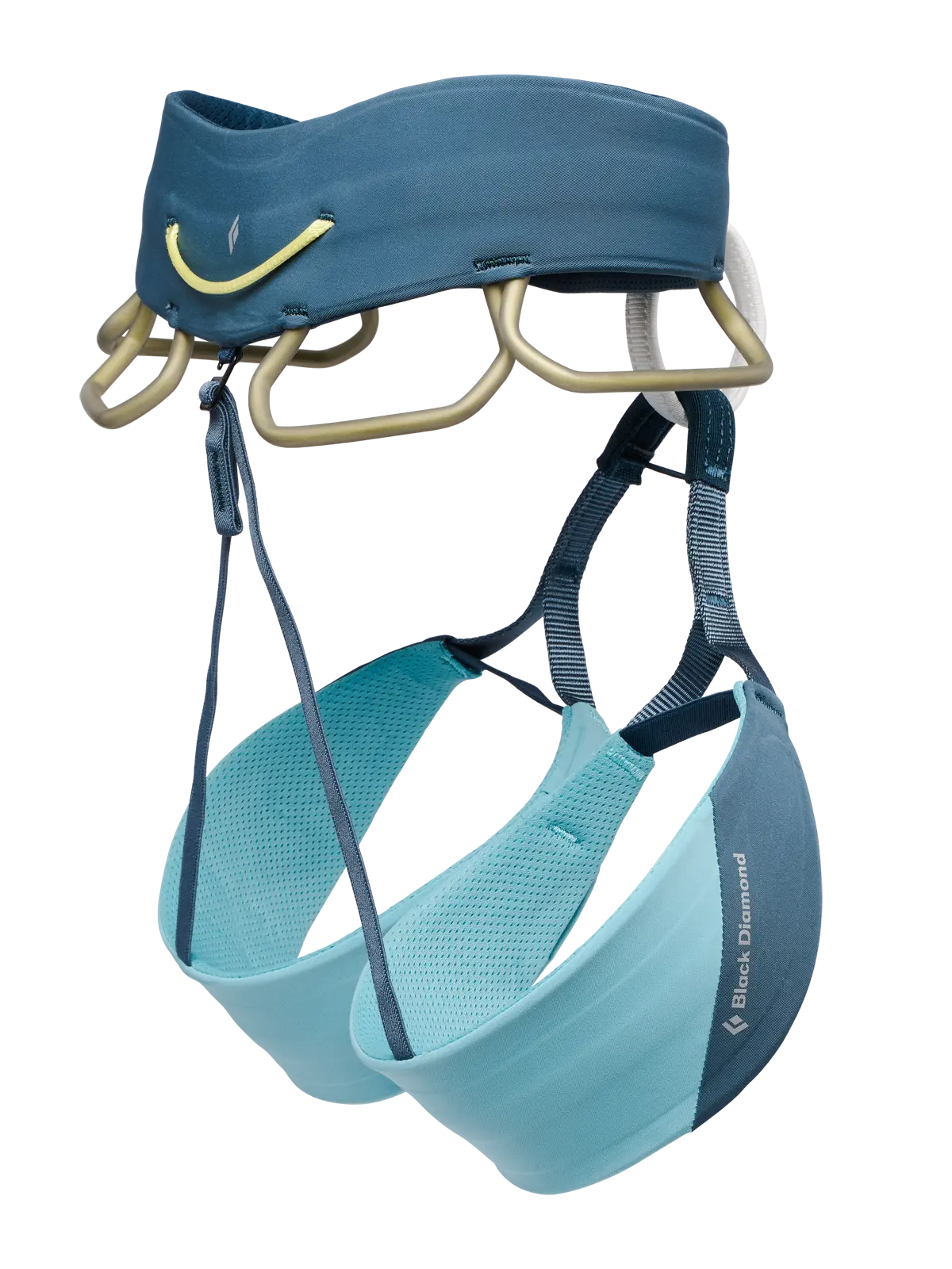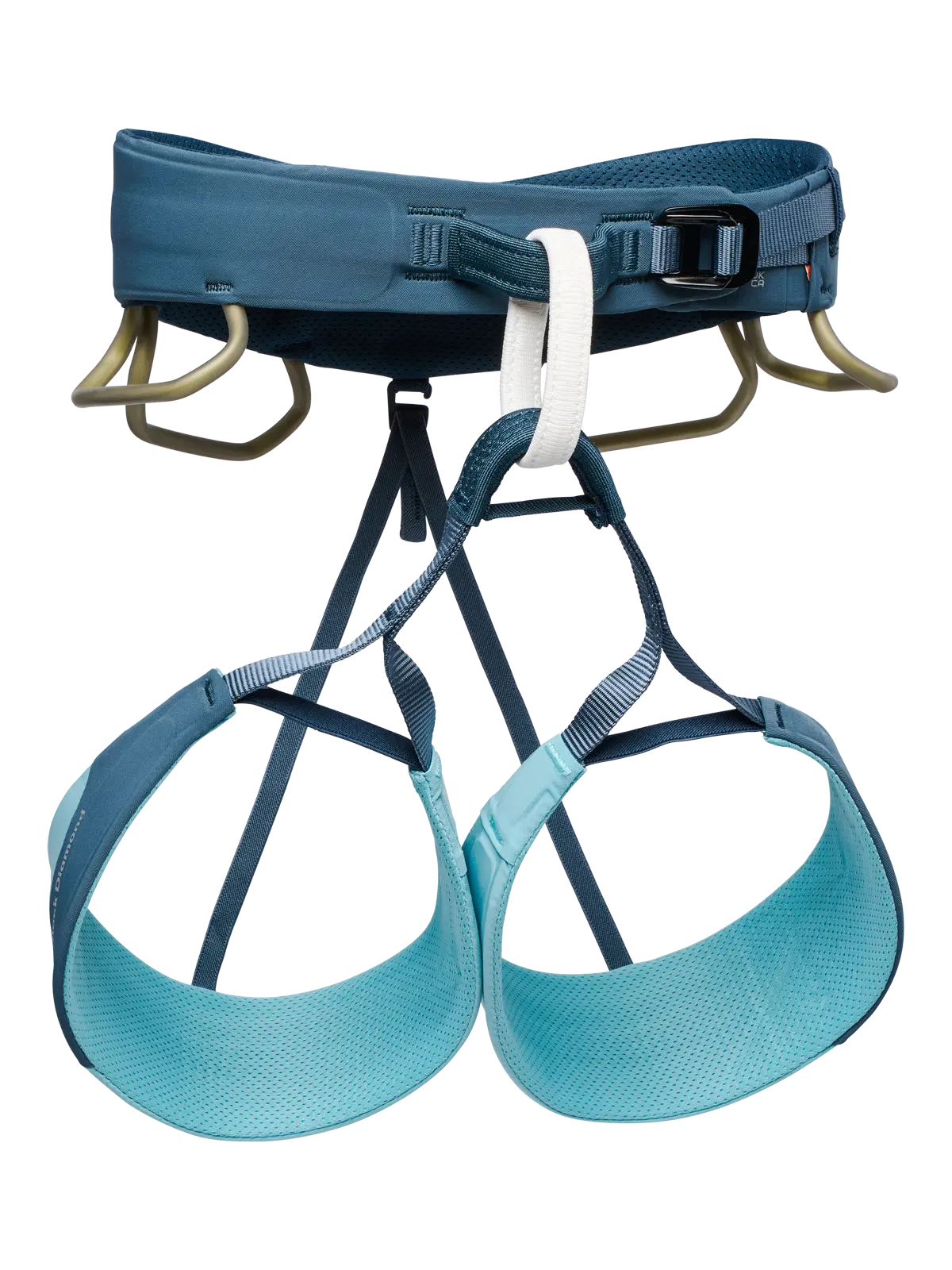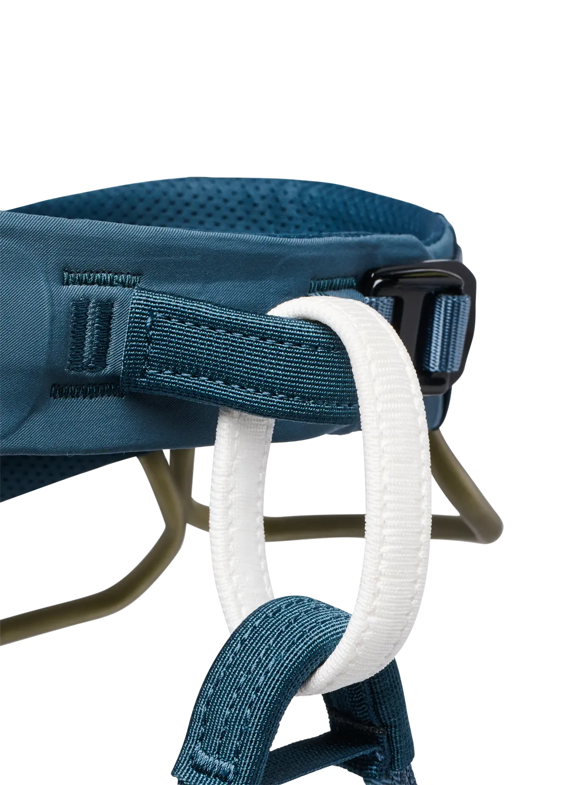 ソリューションは幅広いスタイルのクライミングに対応するハーネス。コントワーエッジ構造のレッグループとウエストベルトは、中心部に剛性を持たせながらエッジ部分をソフトに仕上げており、圧迫感を軽減して身体にフィットします。各ギアループに最大15本のクイックドローがラッキング可能な大容量ギアループを装備しており、ダブルラックを快適に運びながらマルチピッチのリンクにも対応。さらにシームレスなインフィニティビレイループと、後部に第5ギアループも備えており、オールラウンドクライマーに理想的なハーネスとなっています。