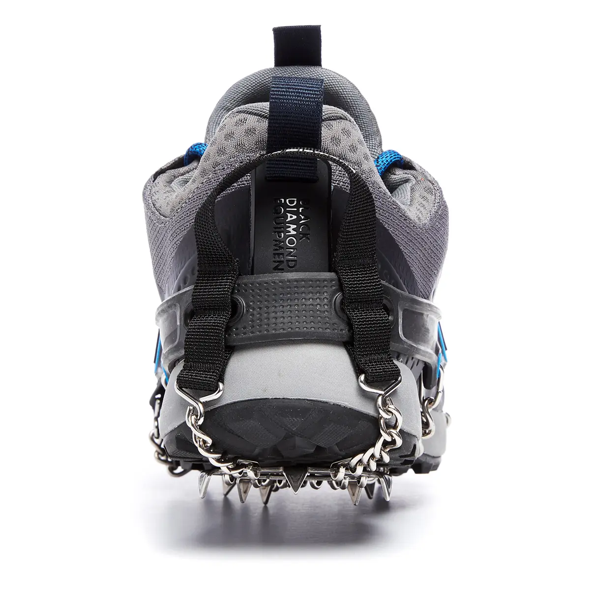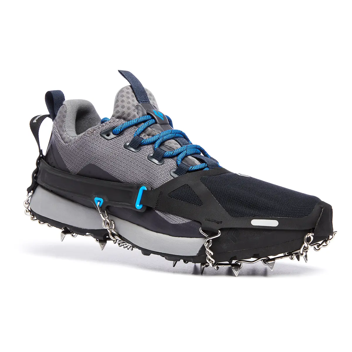 冬場のランニングシーンで優れた走破性を発揮する、軽量でコンパクトなトレランシューズ用トラクションディバイス。高さ8mmの尖鋭状の14本のステンレス製スパイクが堅雪やアイスバーンをしっかりと捉えて優れた安定性と足裏感覚を発揮し、フロントセンターポイントに配置された1本のスパイクが蹴り出しの駆動力を効果的につま先に伝えます。アッパーはソフトシェル(トー側)とエラストマー(ヒール側)を組み合わせたハイブリッド構造。トー側のカバーは雪の浸入をシャットアウトして、つま先の保温性を確保しシューズの濡れと蒸れを防ぎます。ヒールに装備されたウェビングループはスムーズな着脱をサポートし識別性を高めます。