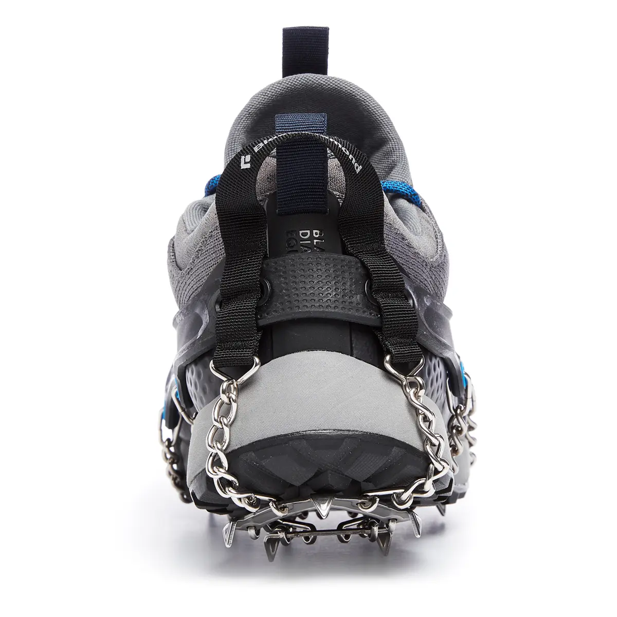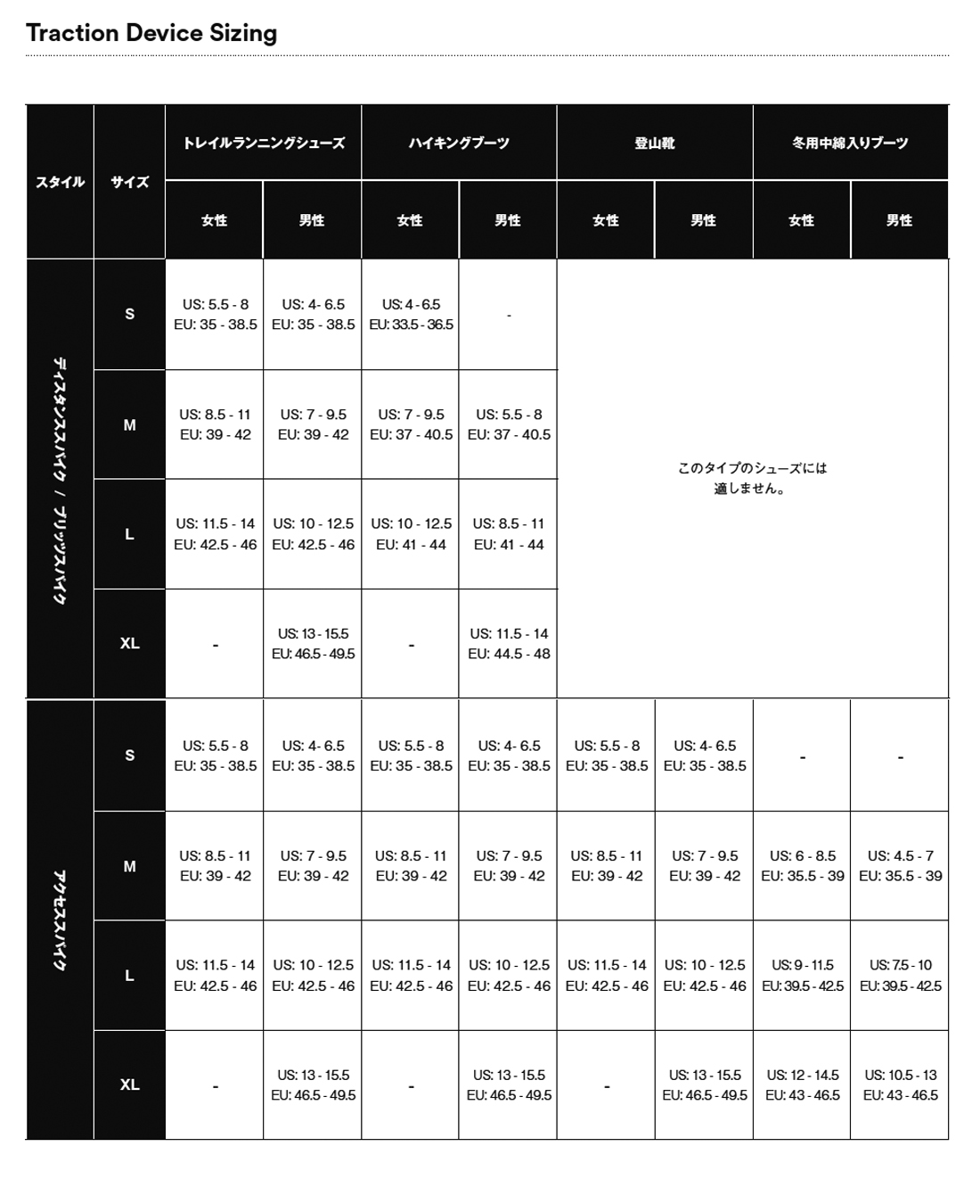 冬期の山小屋までのアプローチ、積雪期や残雪期の低山ハイキング、市街地の積雪歩行など幅広い用途に適した軽量トラクションディバイス。高さ8mmの尖鋭状の14本のステンレス製スパイクが堅雪やアイスバーンをしっかり捉え、優れたバランス性能と足裏感覚を実現しています。フロントセンターポイントに配置された1本のスパイクが駆動力を効果的につま先に伝えます。エラストマー製フルハーネスは汎用性が高く、アプローチシューズから冬山用の登山靴まで様々なタイプのブーツに装着できます。ヒールに装備されたウェビングループはスムーズな着脱をサポートし識別性を高めます。