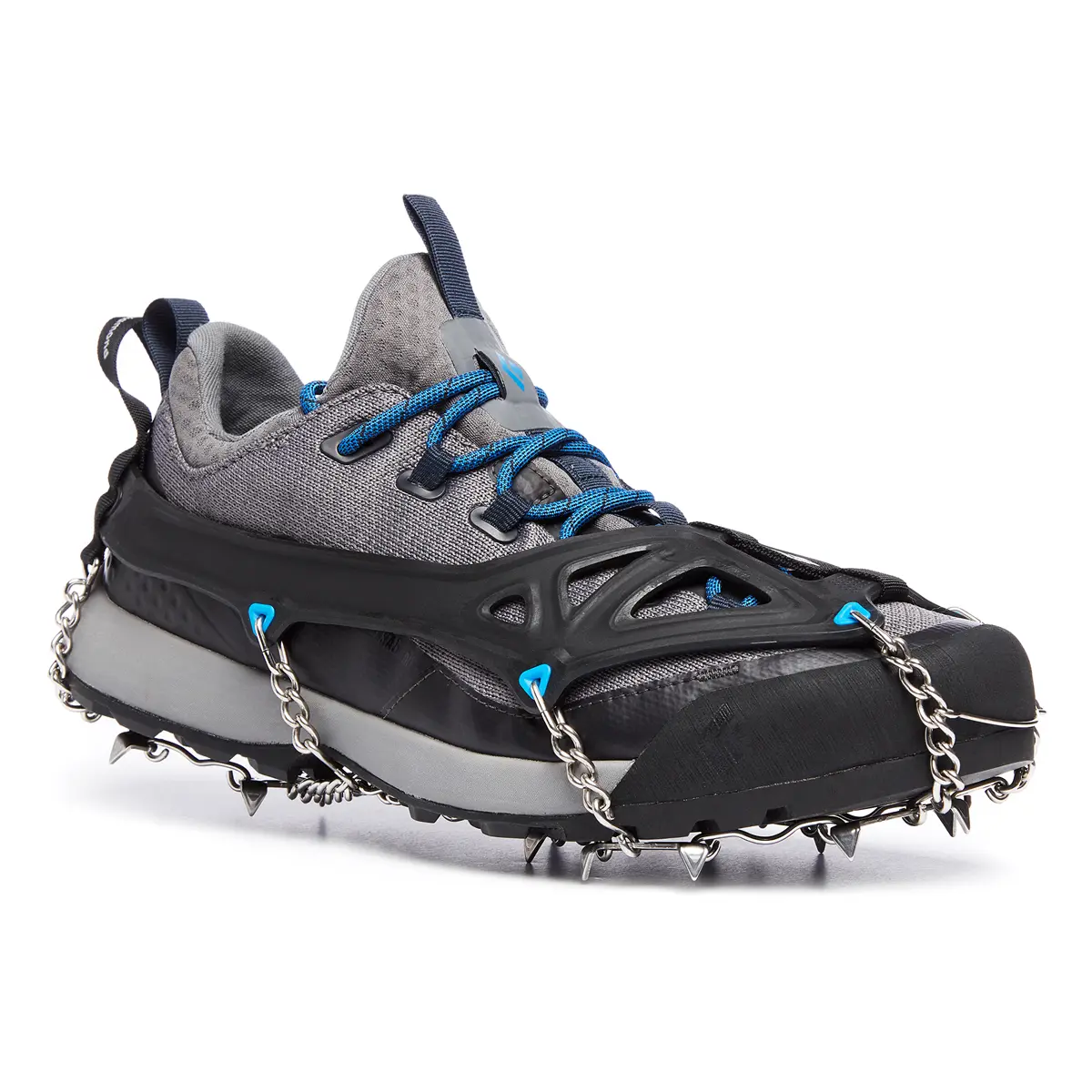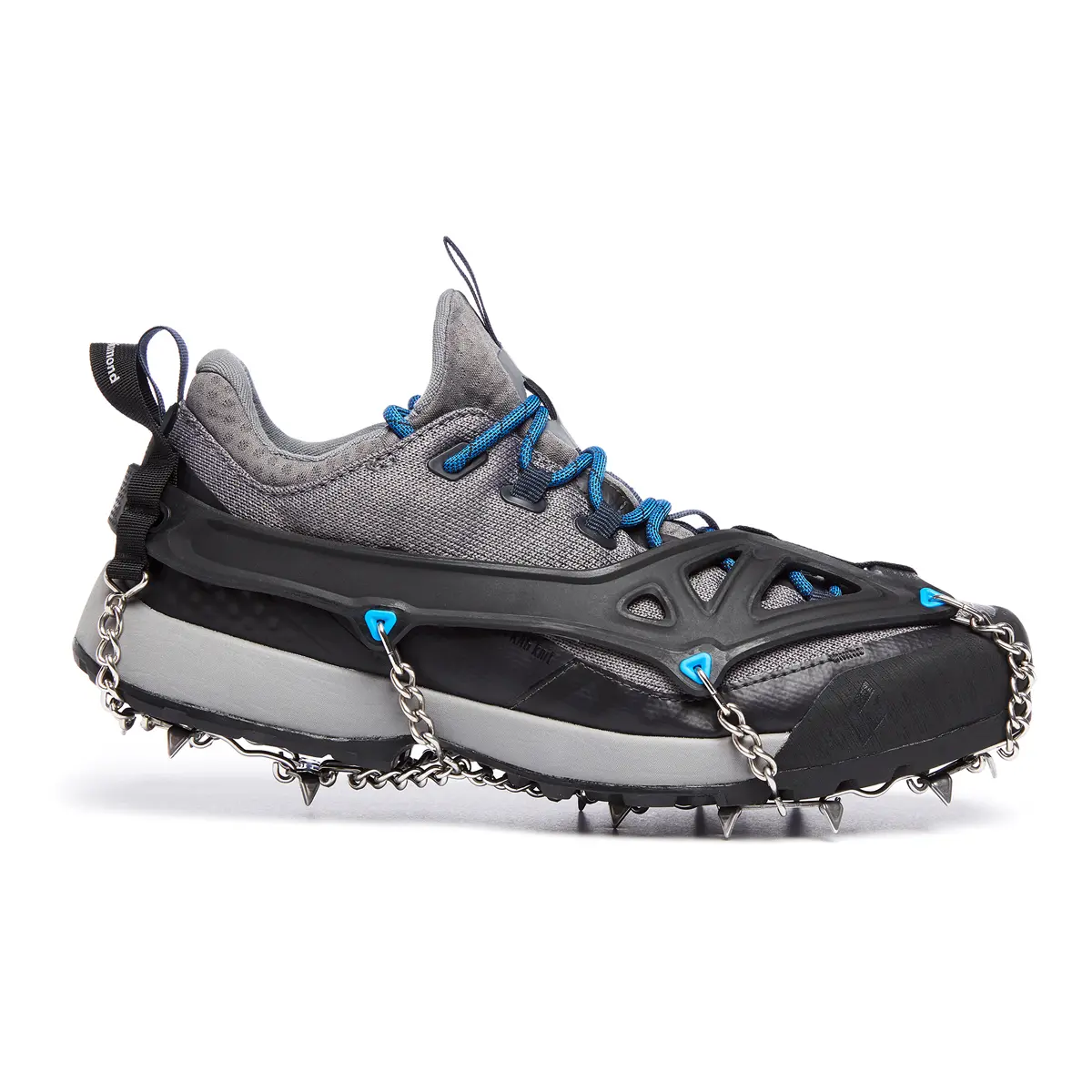 冬期の山小屋までのアプローチ、積雪期や残雪期の低山ハイキング、市街地の積雪歩行など幅広い用途に適した軽量トラクションディバイス。高さ8mmの尖鋭状の14本のステンレス製スパイクが堅雪やアイスバーンをしっかり捉え、優れたバランス性能と足裏感覚を実現しています。フロントセンターポイントに配置された1本のスパイクが駆動力を効果的につま先に伝えます。エラストマー製フルハーネスは汎用性が高く、アプローチシューズから冬山用の登山靴まで様々なタイプのブーツに装着できます。ヒールに装備されたウェビングループはスムーズな着脱をサポートし識別性を高めます。