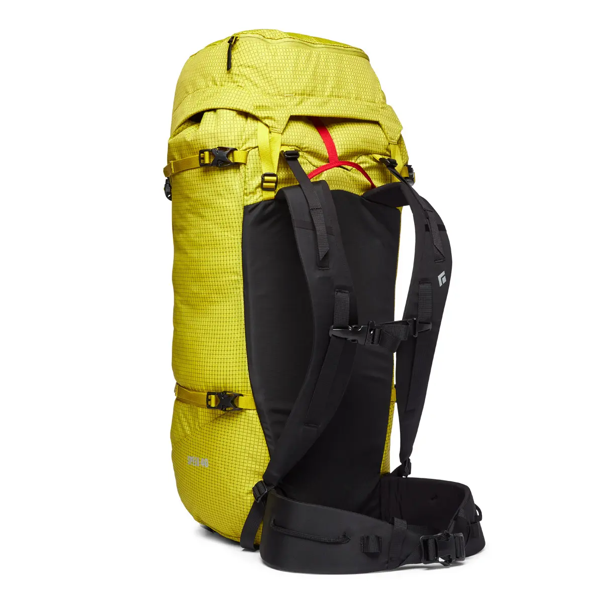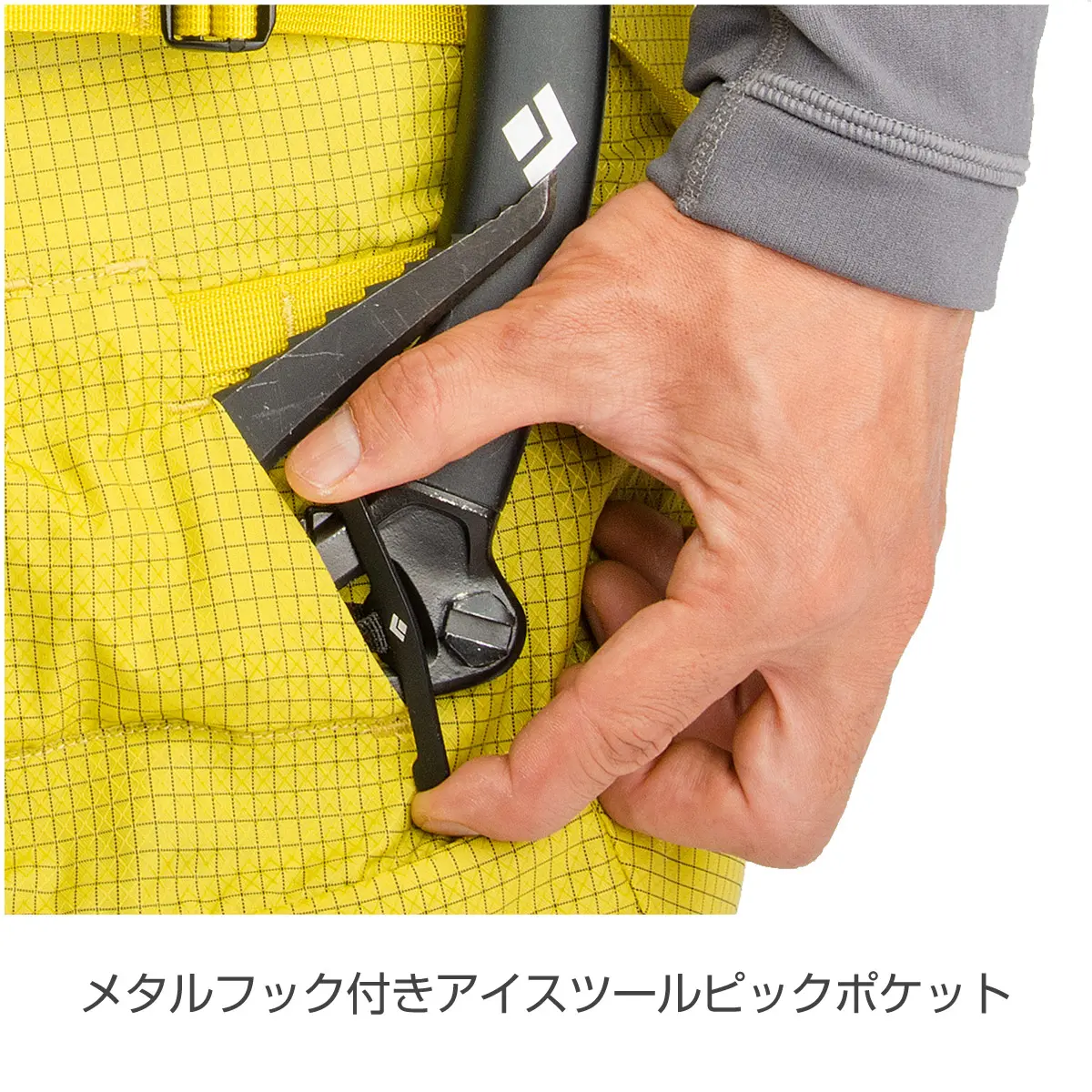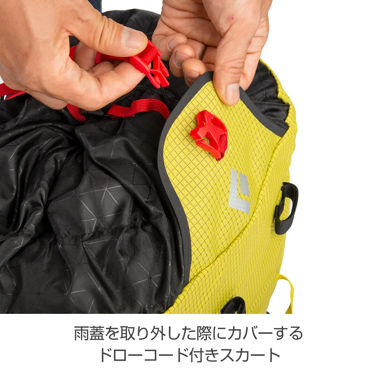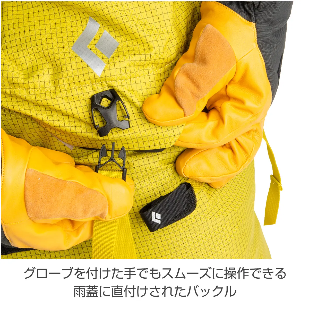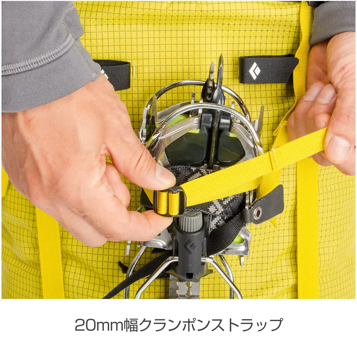 クライミングに不可欠な機能のみに的を絞ったシンプルなアルパインパック。UTS(Ultra Tear Strength)コーティングを施した210d Xリップナイロンを採用。耐摩耗性、引き裂き強度、撥水性に優れます。メインストラップのバックルは雨蓋に直付けされ、グローブを付けた手でもスムーズに操作できます。ヒップベルトやフレームシートを外せば、さらなる軽量化を図れます。環境に配慮したDWR(耐久撥水)加工(製造工程でのPFAS不添加)を採用。