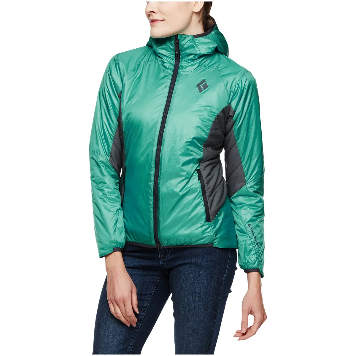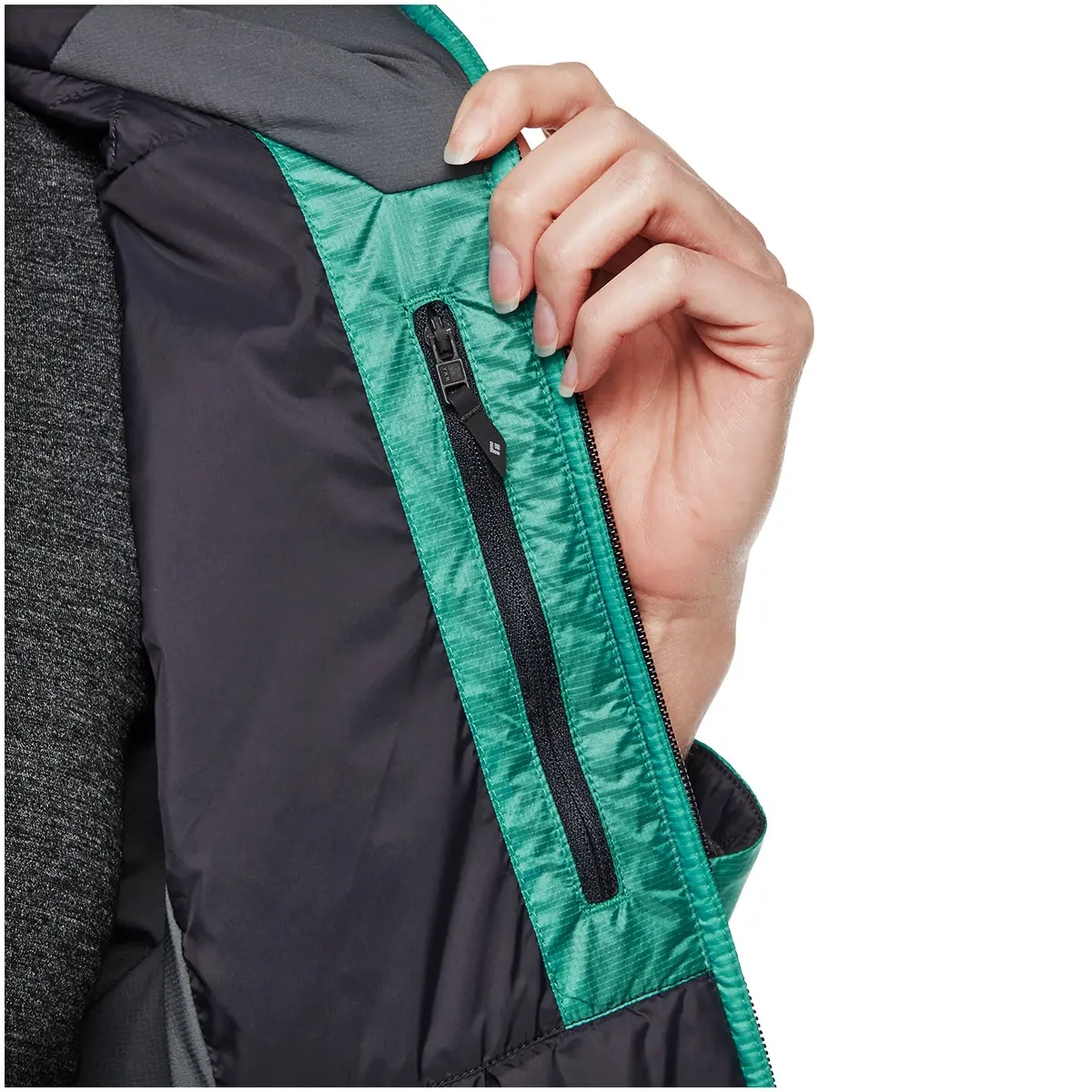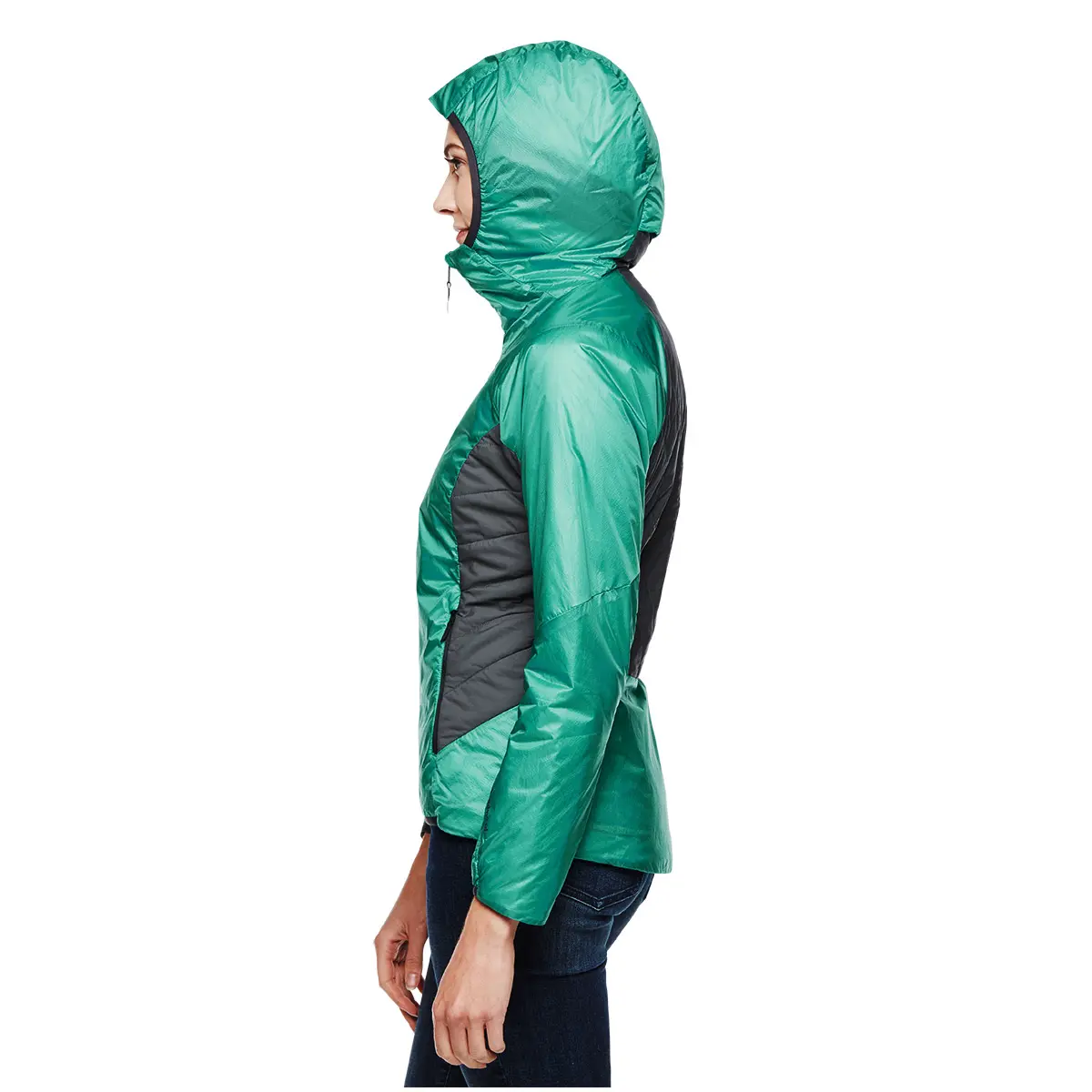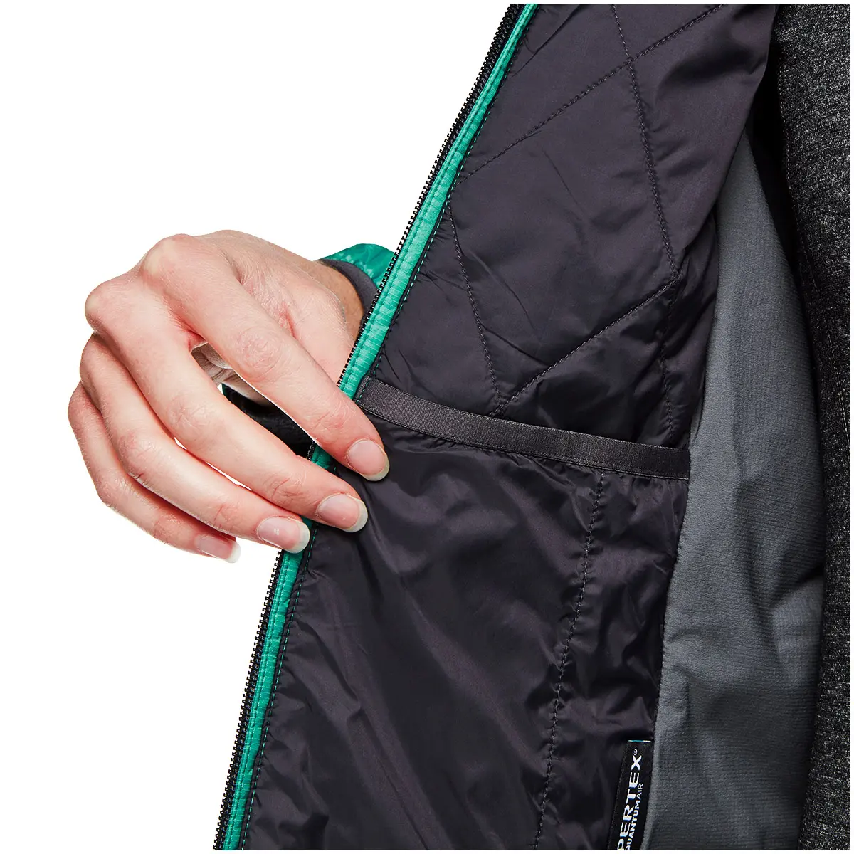 通気性と保温性を兼ね備えたインサレーションフーディー。雪山やバックカントリーなら中間着、マルチピッチならアウターといった使い方ができます。中綿には宇宙服にも使用されているNASAが開発したエアロジェルとプリマロフトをミックス。超軽量ながら断熱性に優れ、従来のプリマロフトより保温性が約20~30%アップしています。シェルの傷みやすい箇所には耐熱性に優れたLCP樹脂を使用。脇や背中には通気性のあるストレッチナイロンを配置し、撥水加工は通常の10倍の耐久性を備えたGTT社のDWR(耐久撥水)加工(製造工程でのPFAS不添加)を採用しました。ハーネスに干渉しないジッパーポケットや、裾からの冷気の流入を防ぐパウダースカート、クライミングヘルメット対応フード、グローブやビーニーを収納できる深い内ポケット、パッカブル仕様など、スキーやクライミングに便利な機能が満載です。
