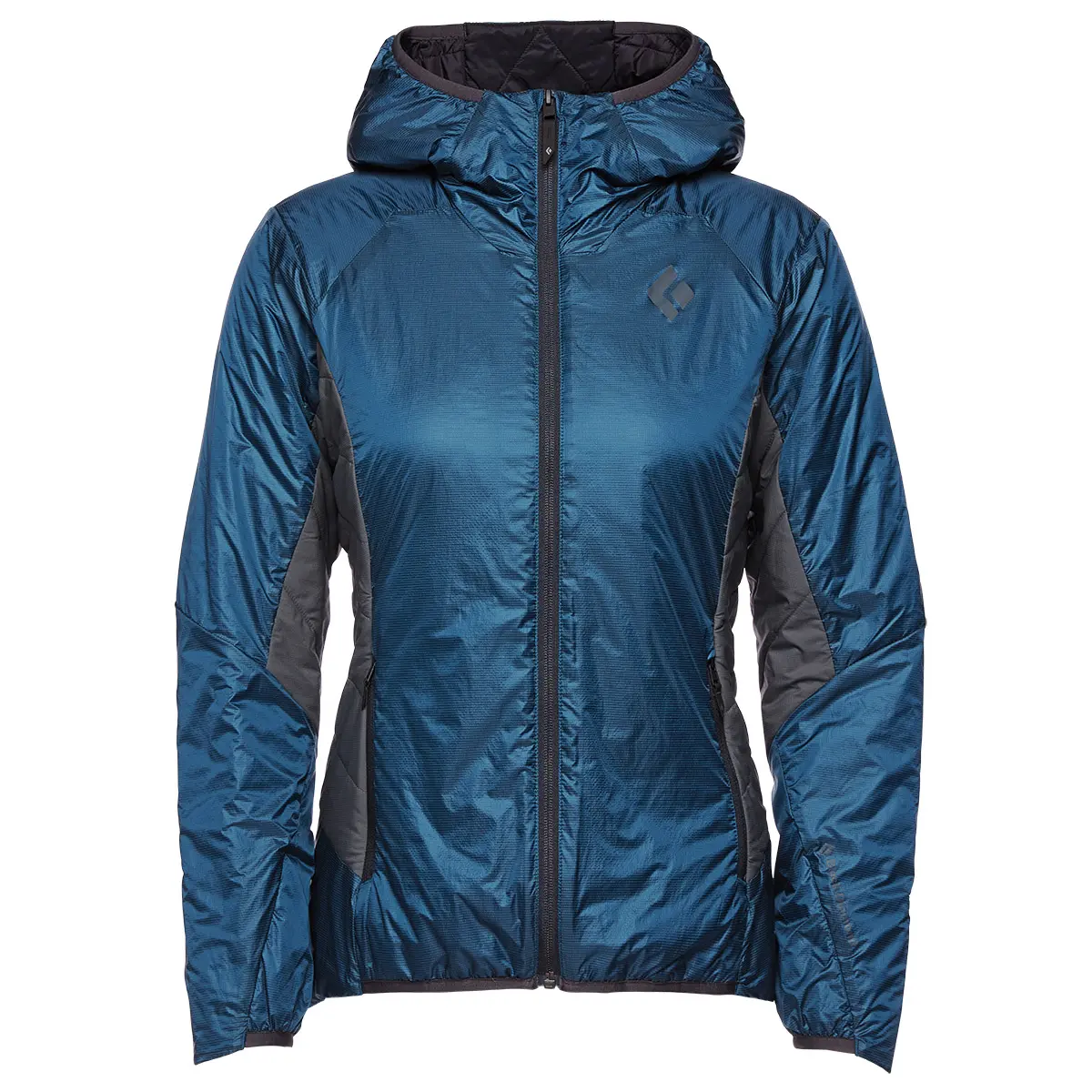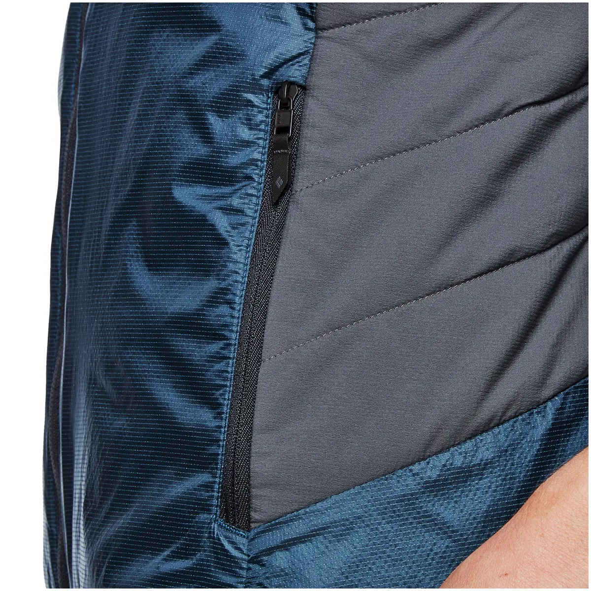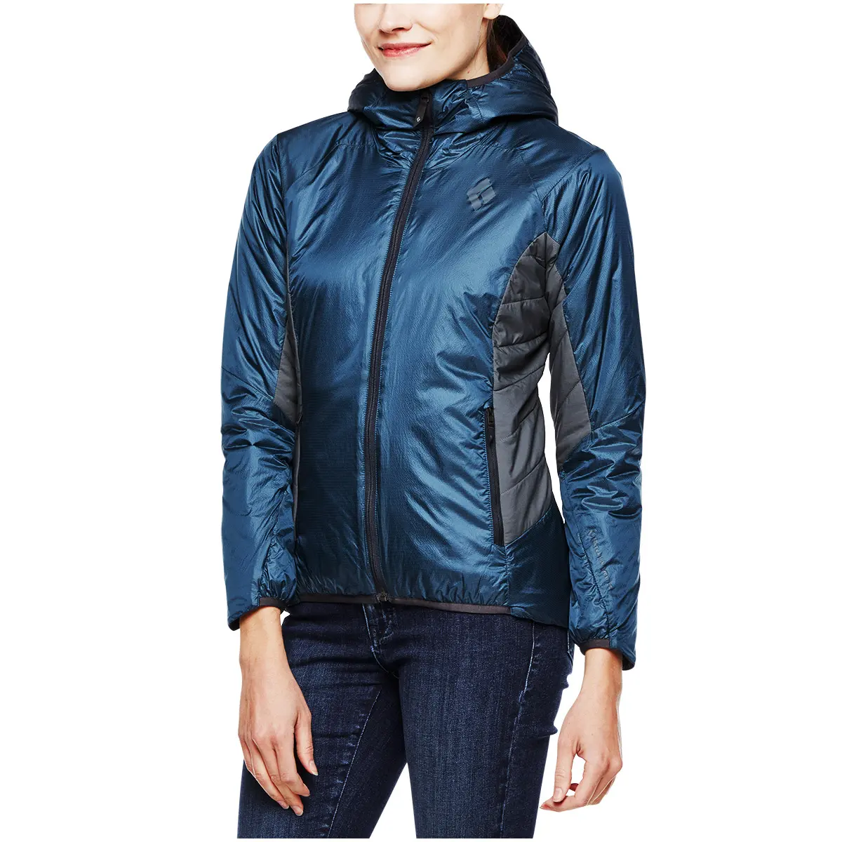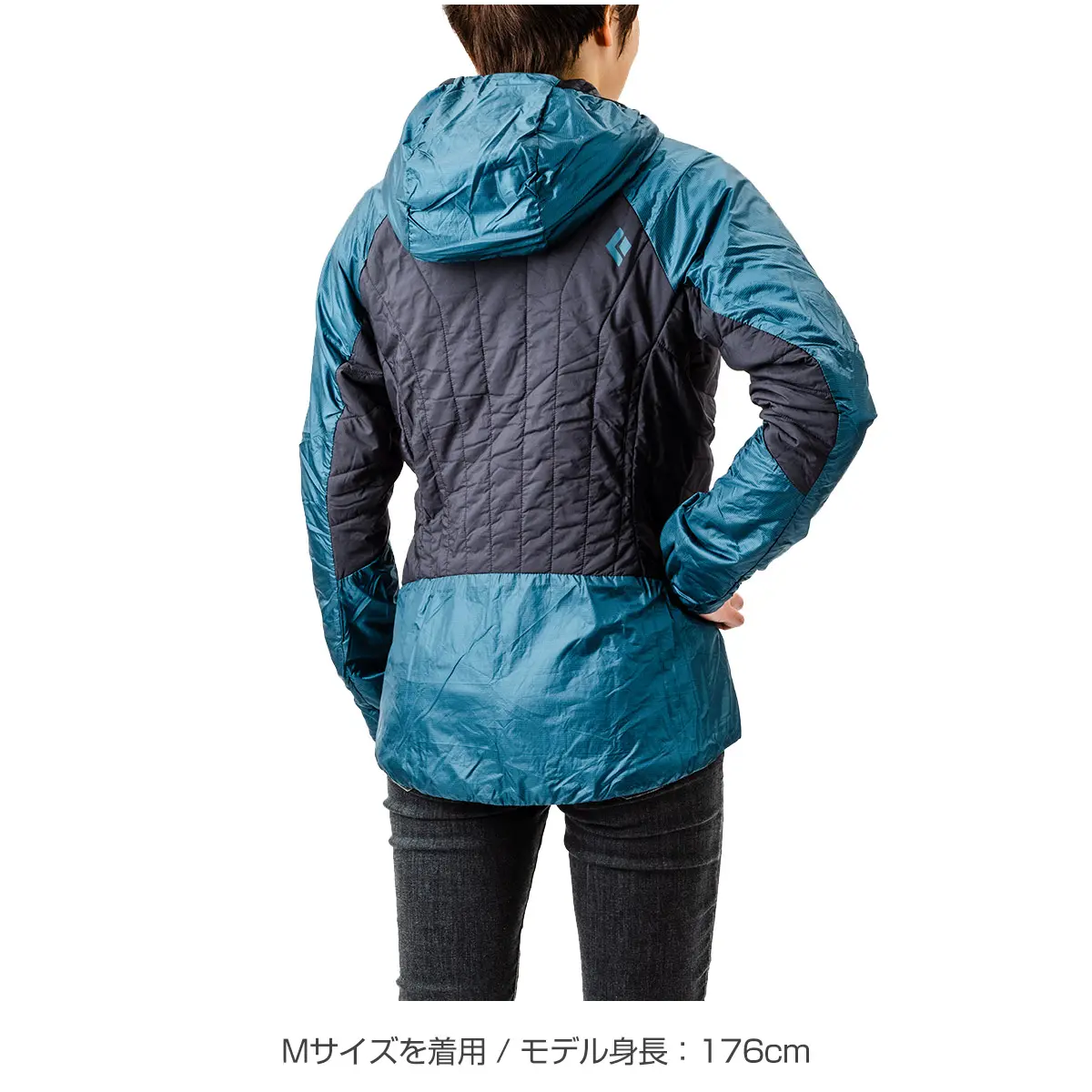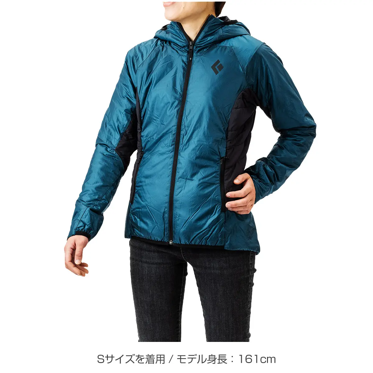 通気性と保温性を兼ね備えたインサレーションフーディー。雪山やバックカントリーなら中間着、マルチピッチならアウターといった使い方ができます。中綿には宇宙服にも使用されているNASAが開発したエアロジェルとプリマロフトをミックス。超軽量ながら断熱性に優れ、従来のプリマロフトより保温性が約20~30%アップしています。シェルの傷みやすい箇所には耐熱性に優れたLCP樹脂を使用。脇や背中には通気性のあるストレッチナイロンを配置し、撥水加工は通常の10倍の耐久性を備えたGTT社のDWR(耐久撥水)加工(製造工程でのPFAS不添加)を採用しました。ハーネスに干渉しないジッパーポケットや、裾からの冷気の流入を防ぐパウダースカート、クライミングヘルメット対応フード、グローブやビーニーを収納できる深い内ポケット、パッカブル仕様など、スキーやクライミングに便利な機能が満載です。