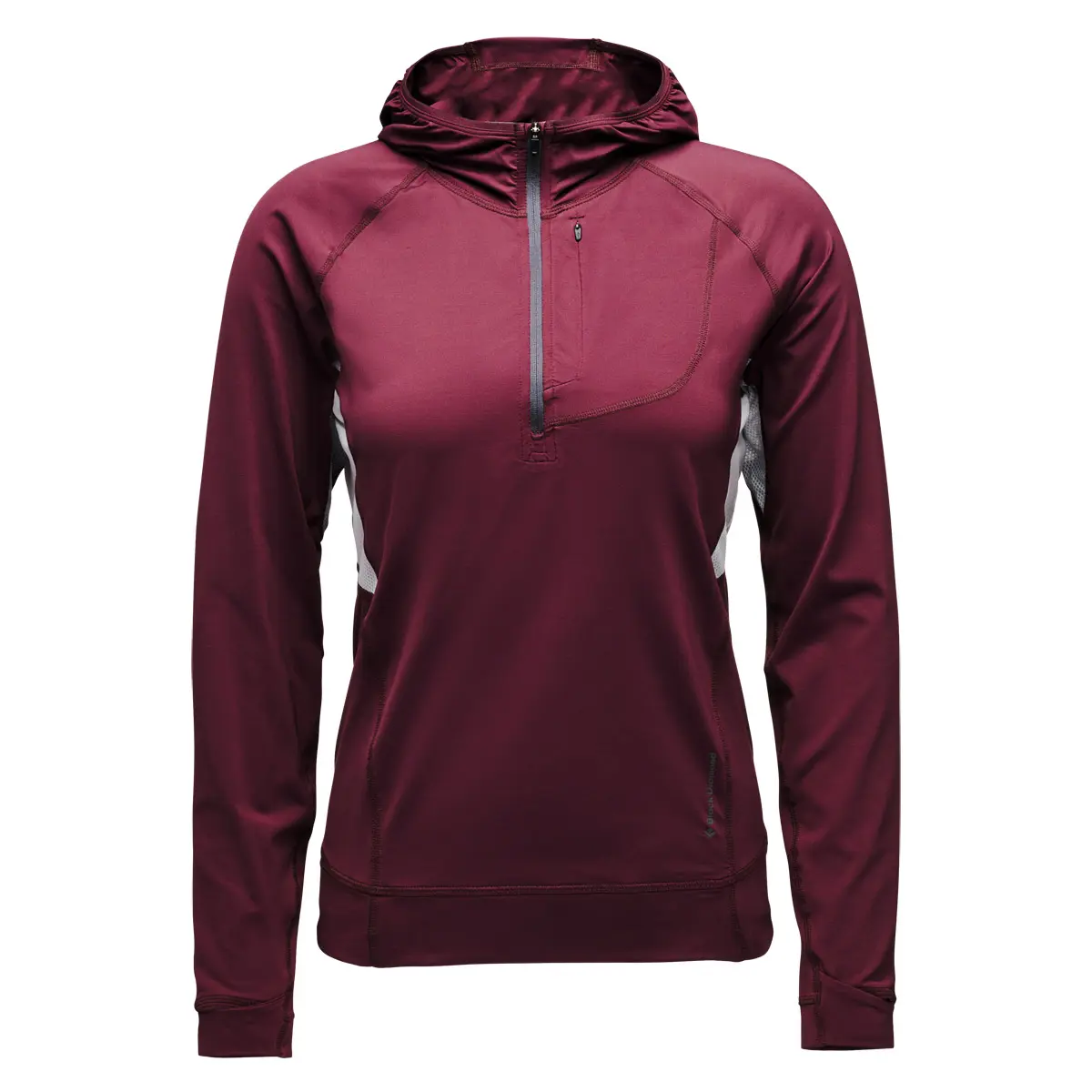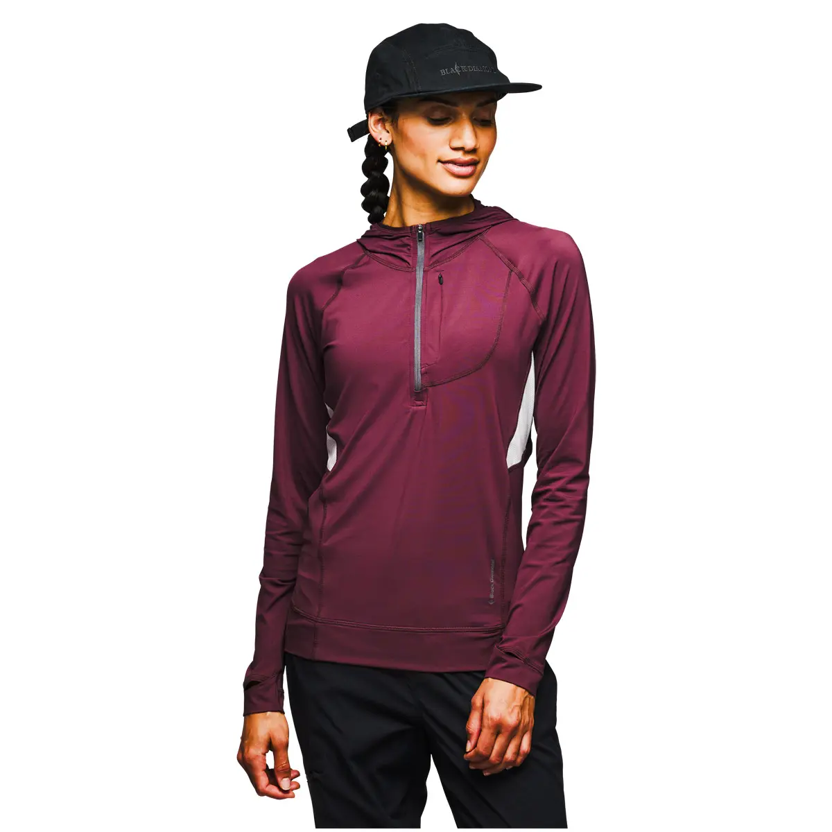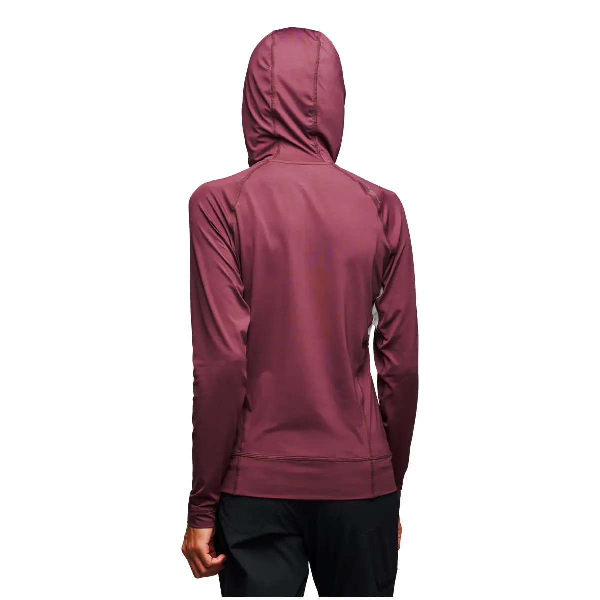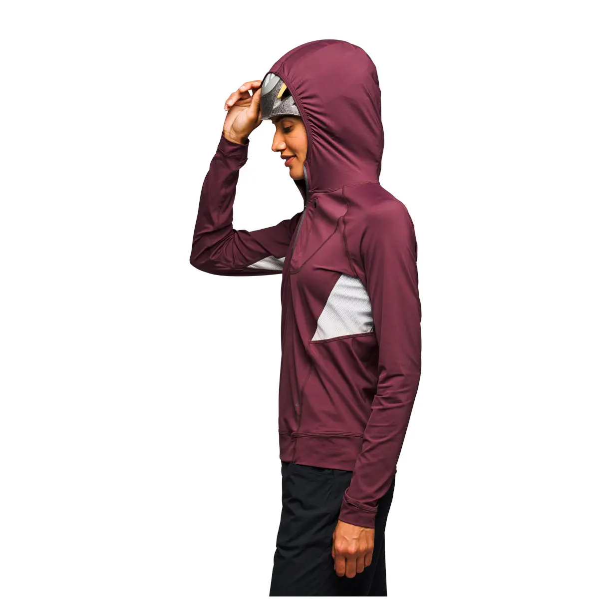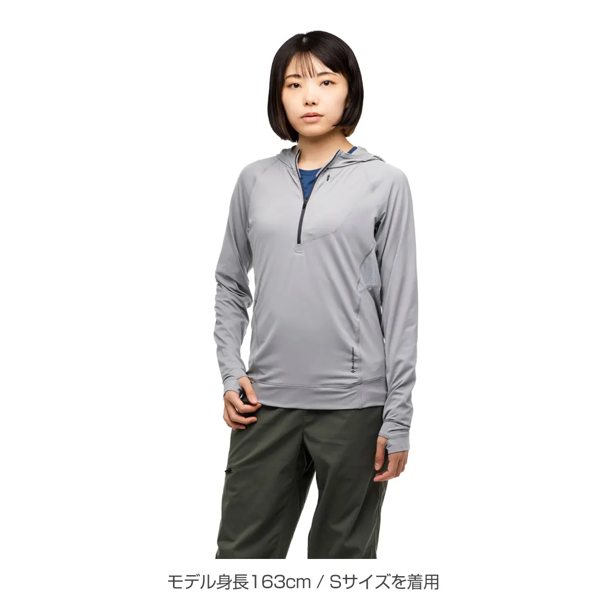アルペングロープロフーディーは予測不能の天候下で優れたUVプロテクションと撥水性を発揮します。UPF 50+の生地にGTT社のDWR(耐久撥水)加工(製造工程でのPFAS不添加)を追加、これは従来のC-6、C-8、またはC-0 DWRと比較してパフォーマンスに優れた、環境に優しい撥水加工です。体温調節が容易な1/4ジッパーや脇下にメッシュパネル、隠し胸ポケット、親指ループ、ヘルメットと互換性のあるフードを備えており多様なシーンでパフォーマンスを発揮します。