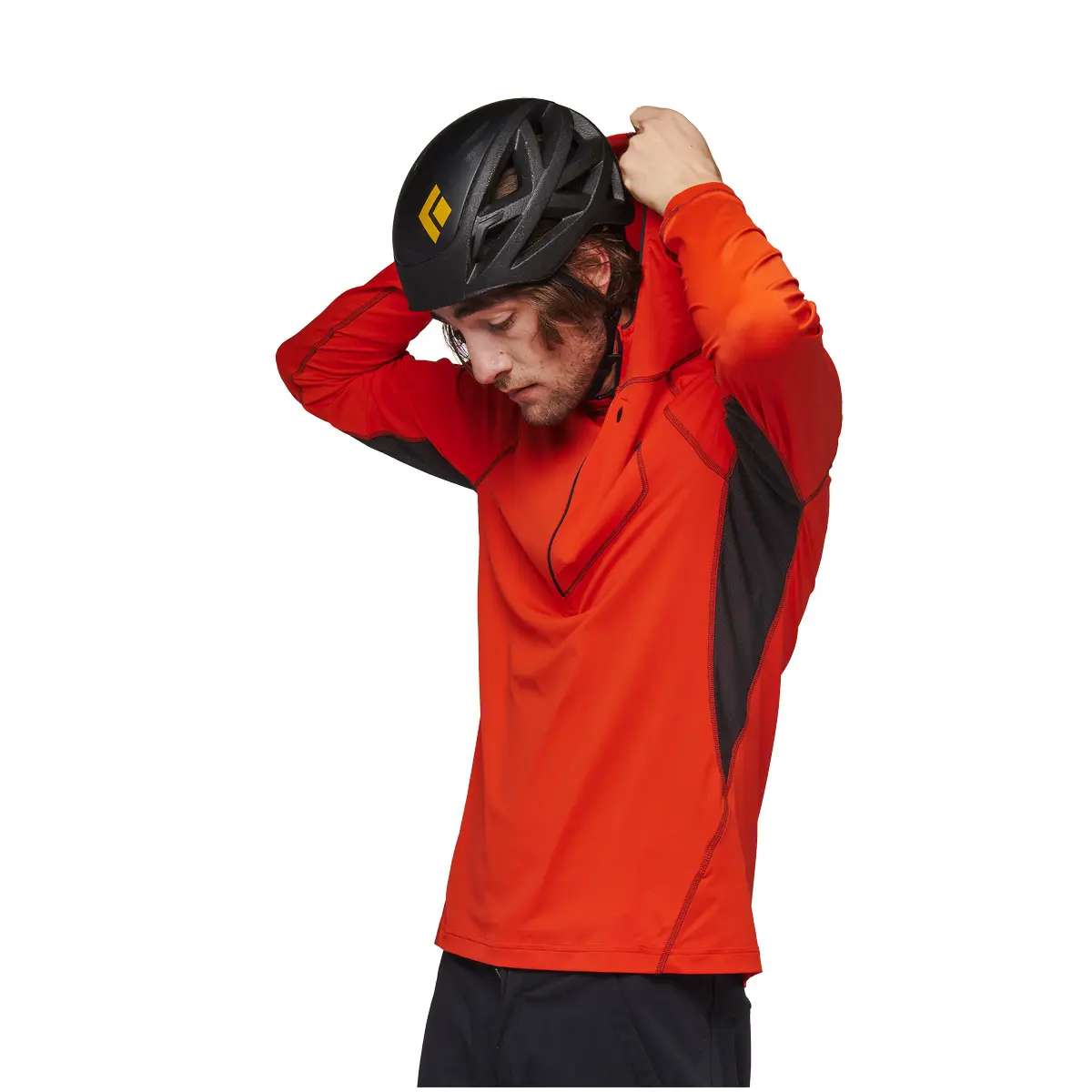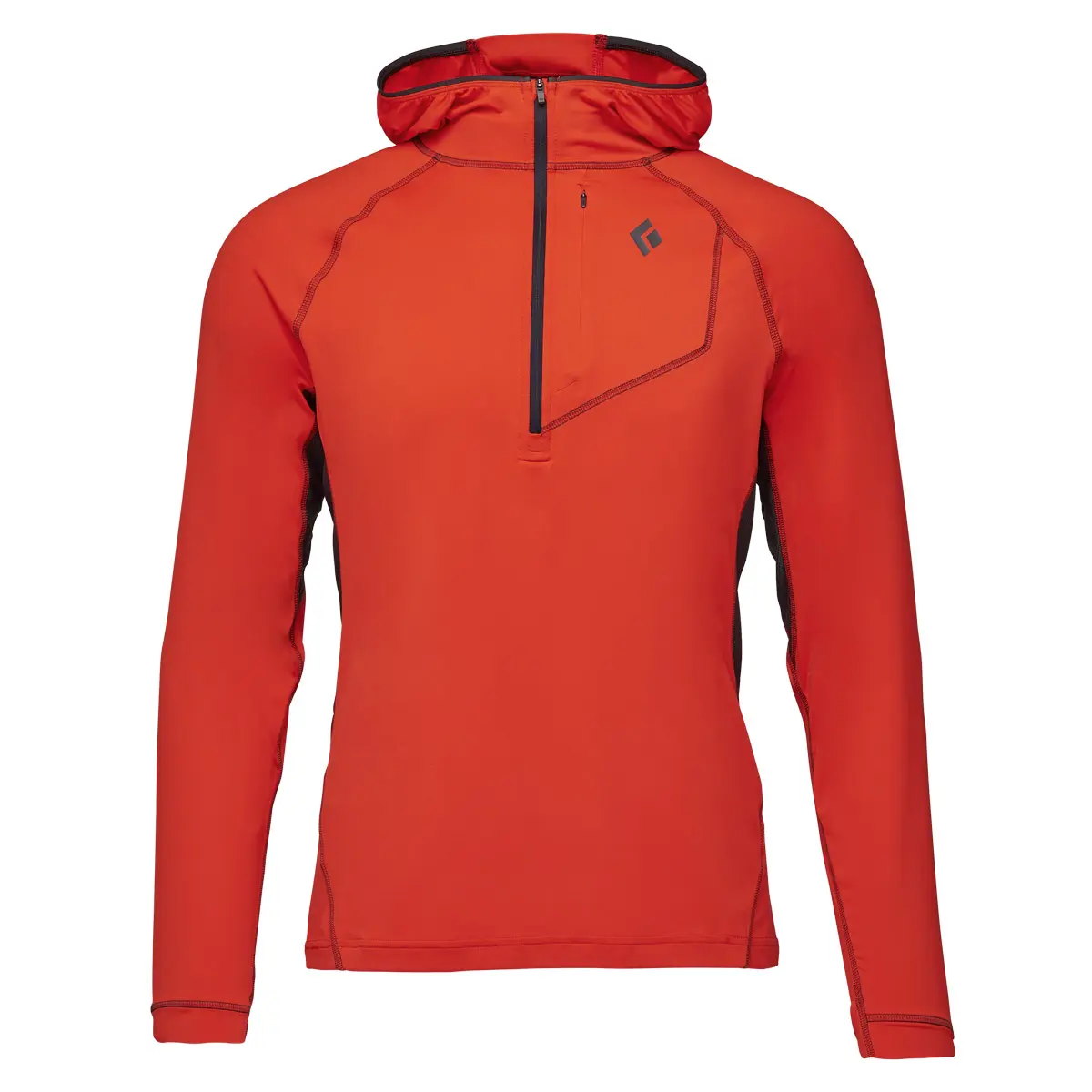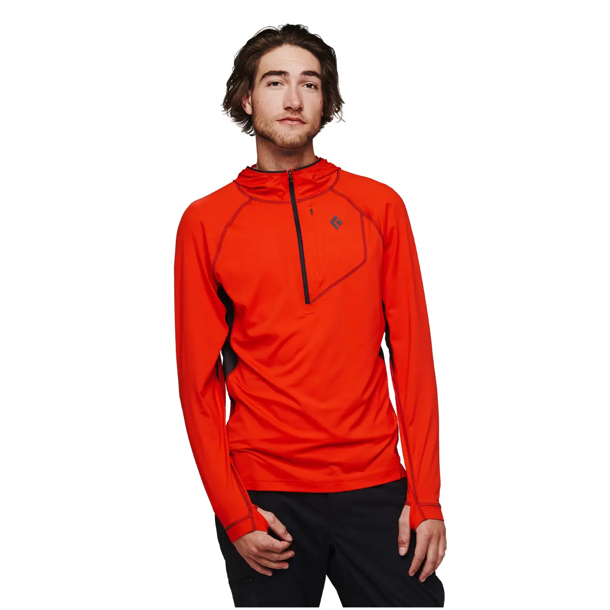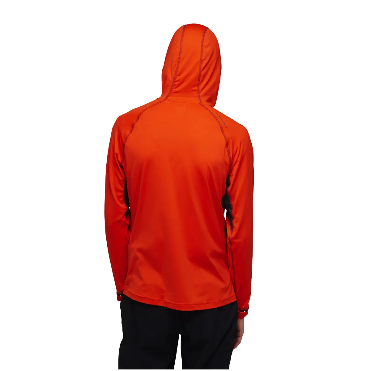 アルペングロープロフーディーは予測不能の天候下で優れたUVプロテクションと撥水性を発揮します。UPF 50+の生地にGTT社のDWR(耐久撥水)加工(製造工程でのPFAS不添加)を追加、これは従来のC-6、C-8、またはC-0 DWRと比較してパフォーマンスに優れた、環境に優しい撥水加工です。体温調節が容易な1/4ジッパーや脇下にメッシュパネル、隠し胸ポケット、親指ループ、ヘルメットと互換性のあるフードを備えており多様なシーンでパフォーマンスを発揮します。