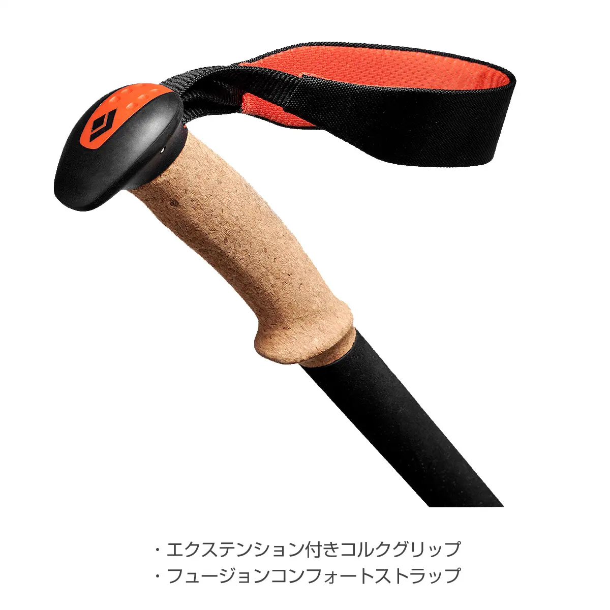 定番4シーズントレッキングポール「トレイル」のコルクグリップバージョン。CNCで削り出した高品質なナチュラルコルクは汗の吸収もよく、手にしっくりとなじみます。さらにハーネスのレッグループと同じ構造のフュージョンコンフォートストラップが手首を優しくサポートします。