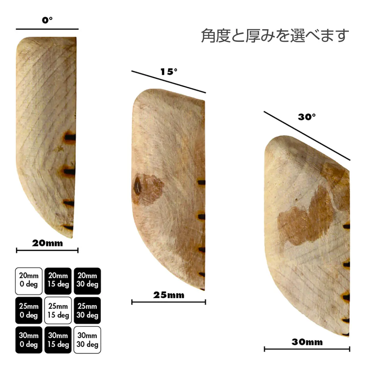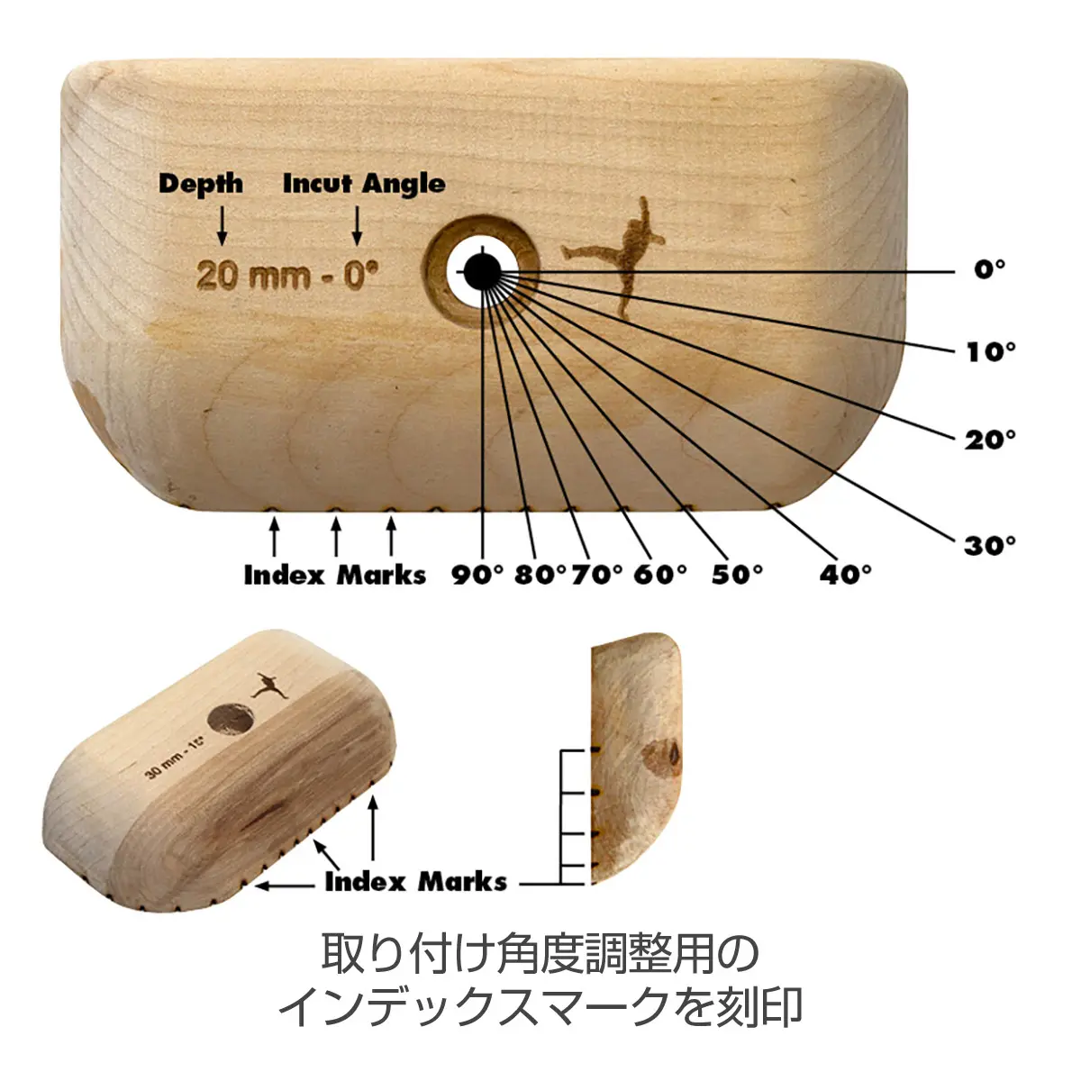 システマチックなトレーニングを行うための木製ホールド。指皮を減らしにくく、グリップに優れます。同一形状のホールドを6個セット。CG設計とCNC加工ににより完璧な均一性と対称性を実現しています。厚みと保持面の角度を選べるので、思いのままのセッティングが可能。エッジの場合、厚さは20mm、25mm、30mmの3タイプ。保持面の角度は0度、15度、30度の3タイプ。ホールドのフチには10度ごとにマークが刻まれており、左右対称に設置することができます。