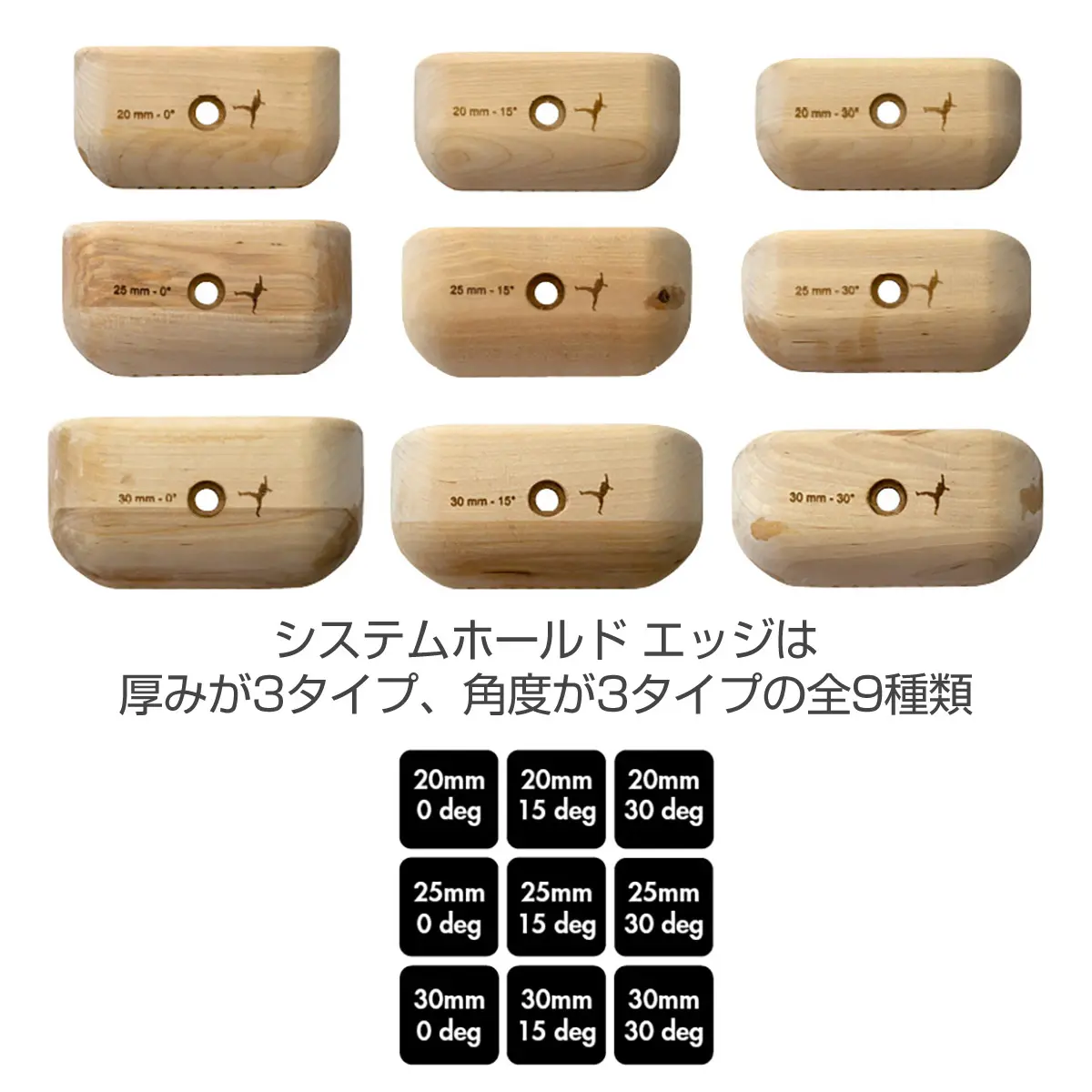 システマチックなトレーニングを行うための木製ホールド。指皮を減らしにくく、グリップに優れます。同一形状のホールドを6個セット。CG設計とCNC加工ににより完璧な均一性と対称性を実現しています。厚みと保持面の角度を選べるので、思いのままのセッティングが可能。エッジの場合、厚さは20mm、25mm、30mmの3タイプ。保持面の角度は0度、15度、30度の3タイプ。ホールドのフチには10度ごとにマークが刻まれており、左右対称に設置することができます。