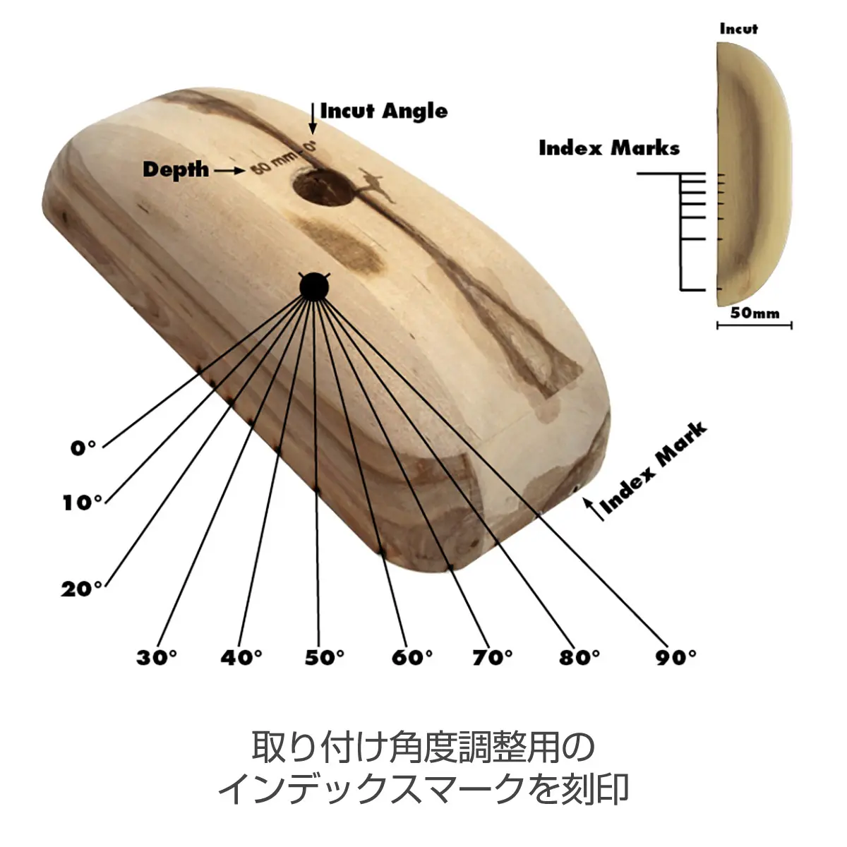 システマチックなトレーニングを行うための木製ホールド。指皮を減らしにくく、グリップに優れます。厚みと保持面の角度を選べるので、思いのままのセッティングが可能。ピンチの場合、厚さは50mm、60mm、70mmの3タイプ。同一形状のホールドを6個セット。CG設計とCNC加工ににより完璧な均一性と対称性を実現しています。保持面は0度とインカットの2タイプ。ホールドのフチには10度ごとにマークが刻まれており、左右対称に設置することができます。