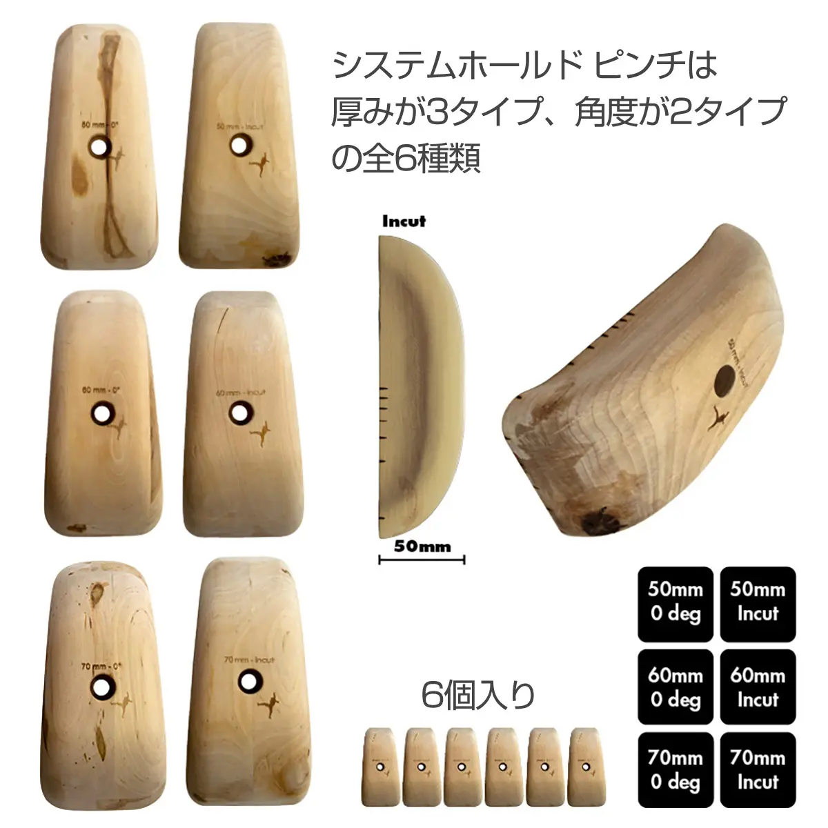システマチックなトレーニングを行うための木製ホールド。指皮を減らしにくく、グリップに優れます。厚みと保持面の角度を選べるので、思いのままのセッティングが可能。ピンチの場合、厚さは50mm、60mm、70mmの3タイプ。同一形状のホールドを6個セット。CG設計とCNC加工ににより完璧な均一性と対称性を実現しています。保持面は0度とインカットの2タイプ。ホールドのフチには10度ごとにマークが刻まれており、左右対称に設置することができます。