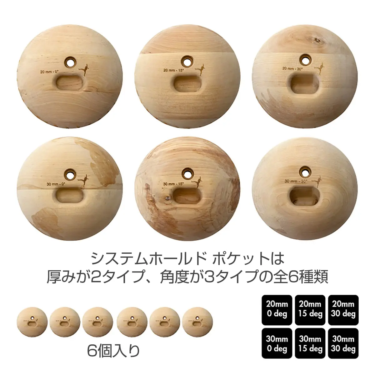 システマチックなトレーニングを行うための木製ホールド。指皮を減らしにくく、グリップに優れます。同一形状のホールドを6個セット。CG設計とCNC加工ににより完璧な均一性と対称性を実現しています。厚みと保持面の角度を選べるので、思いのままのセッティングが可能。ポケットの場合、厚さは20mm、30mmの2タイプ。保持面の角度は0度、15度、30度の3タイプ。ホールドのフチには10度ごとにマークが刻まれており、左右対称に設置することができます。