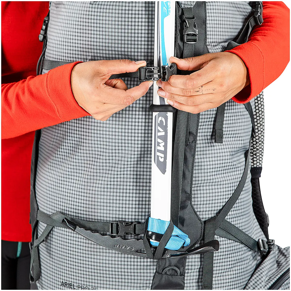 快適でバランスの良い背負い心地と適度な通気性が特長のエアスケープバックパネルを採用した背面システムは、インジェクション成形のフレームシートと身体にフィットさせやすいウェビングによる背面調整の組み合わせで、高荷重に対応しています。