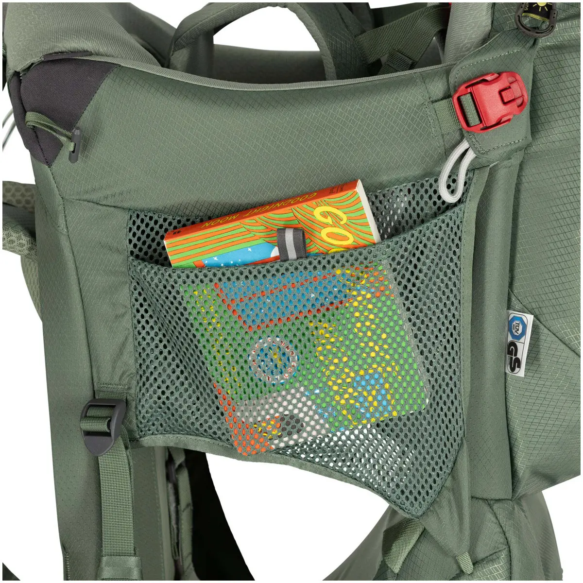 チャイルドシートはフレームとパッド入りで安全性が高く、アウトドアでも安心して子どもを背負うことができます。座席内側を覆うソフトな肌触りの生地は、よだれかけから座面までが一体化しており、取り外して丸洗いが可能。チャイルドセーフティハーネス、シート、フットストラップは子どもの体型に合わせて調整できます。標準装備のビルトインサンシェードは子どもを強い日差しから守るUPF50。ジッパー付き専用ポケットに内蔵されており、素早く展開・収納が可能です。