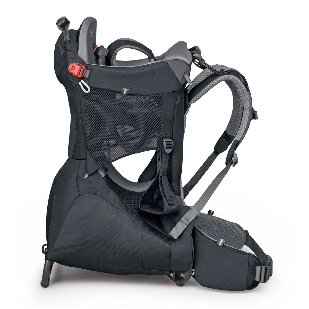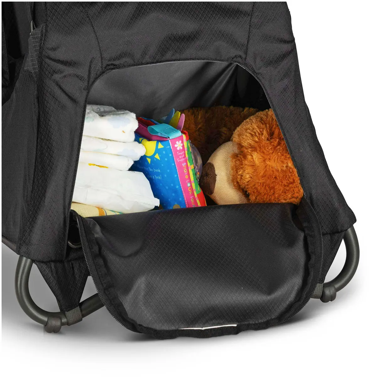優れた剛性と安定性を発揮するチャイルドキャリア。24リットルの収納スペースは着替えやオムツの収納に便利です。