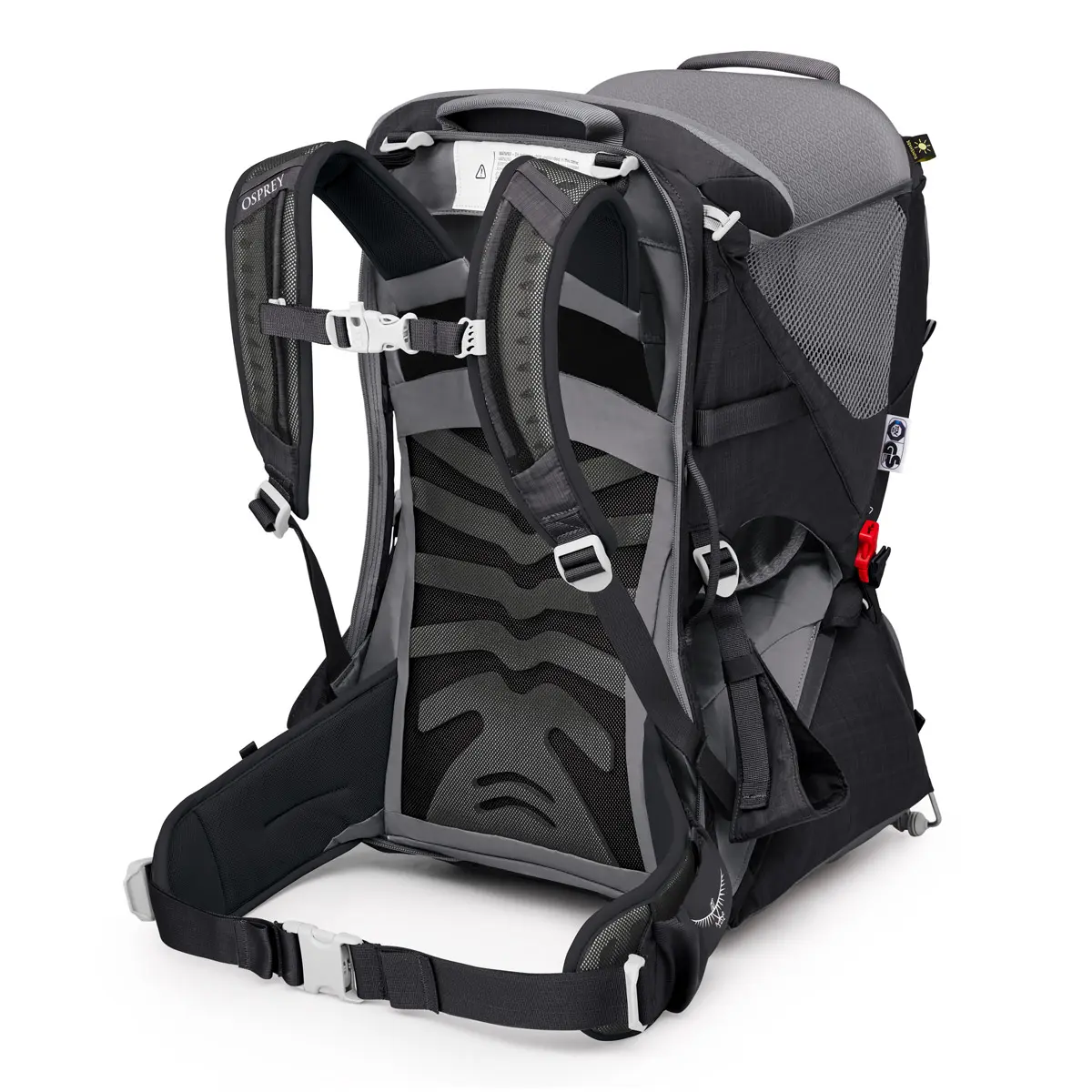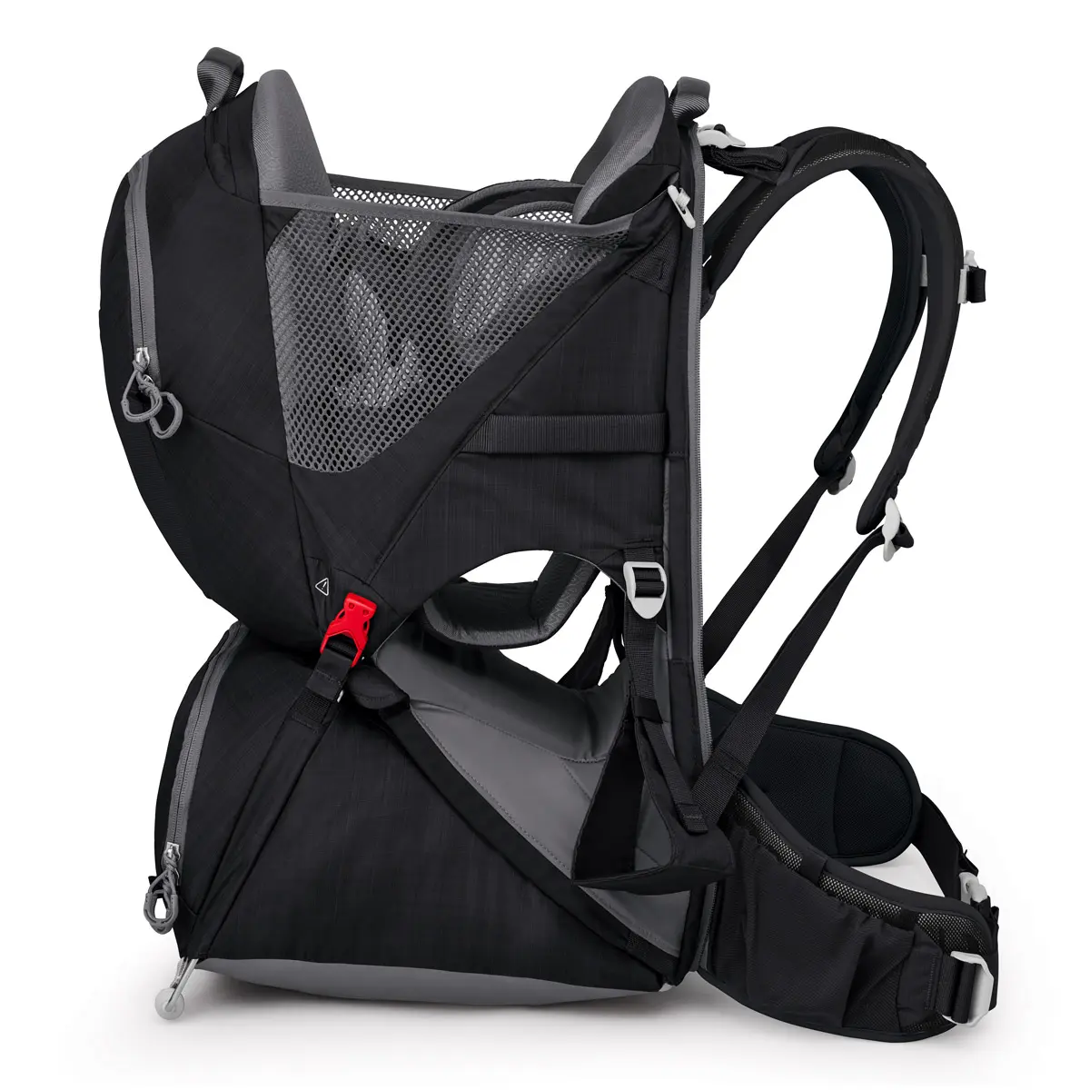 軽量折りたたみフレームを採用し、薄くコンパクトな収納状態を実現した軽量チャイルドキャリア。軽量ながら25リットルの収納スペースは着替えやオムツの収納に便利です。素早く簡単に調整できるショルダーハーネス、ヒップベルト、背面システムは、行動中に背負う人が変わっても快適に背負うことができます。軽量フレームシートに凹凸のあるダイカットフォーム材を接着し、表面をメッシュでカバーした背面構造はエアスケープサスペンションと呼ばれ、安定したフィット感と通気性、背負った時の動きやすさをサポートしてくれます。