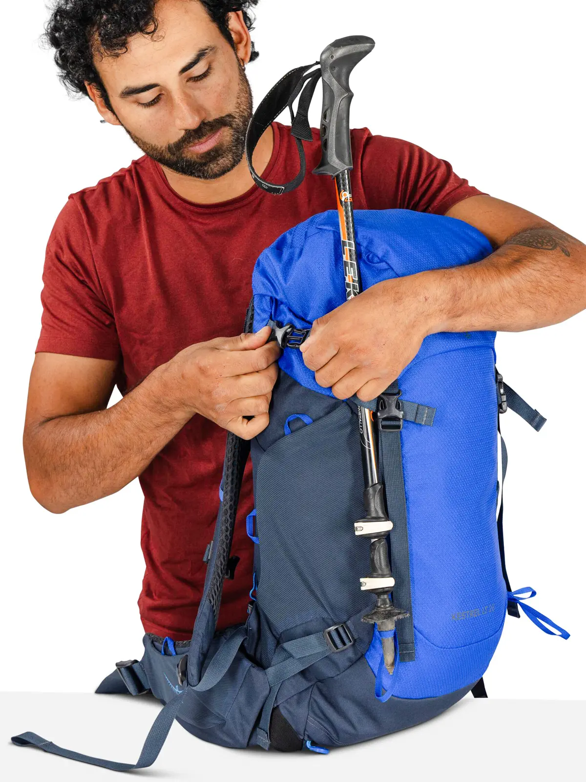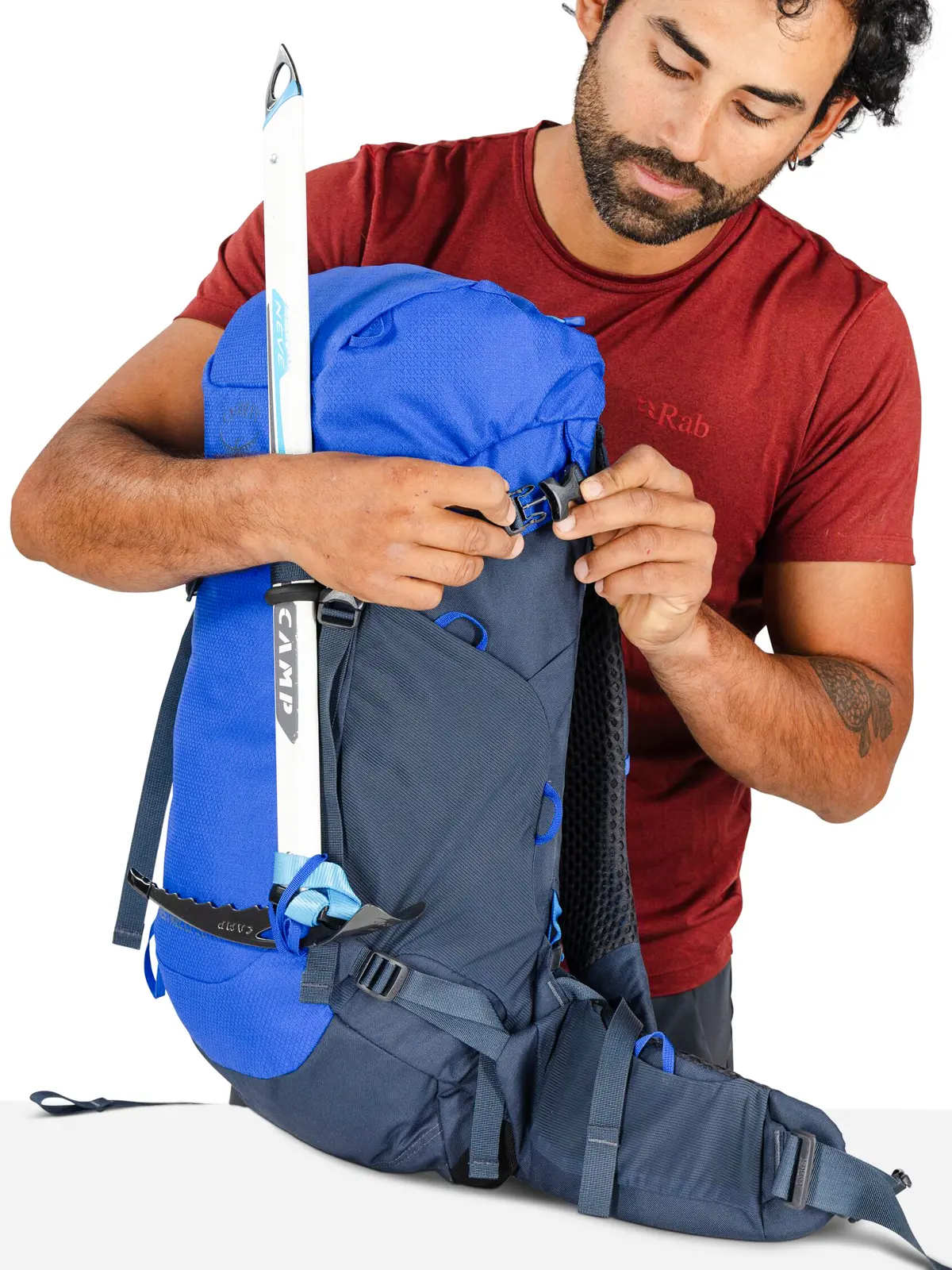 • アイスアックスやトレッキングポールを装着できるツールキャプチャーと上部サイドコンプレッションストラップ