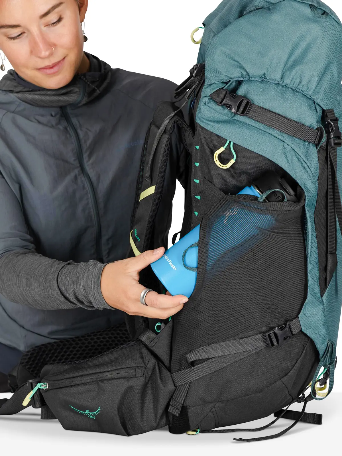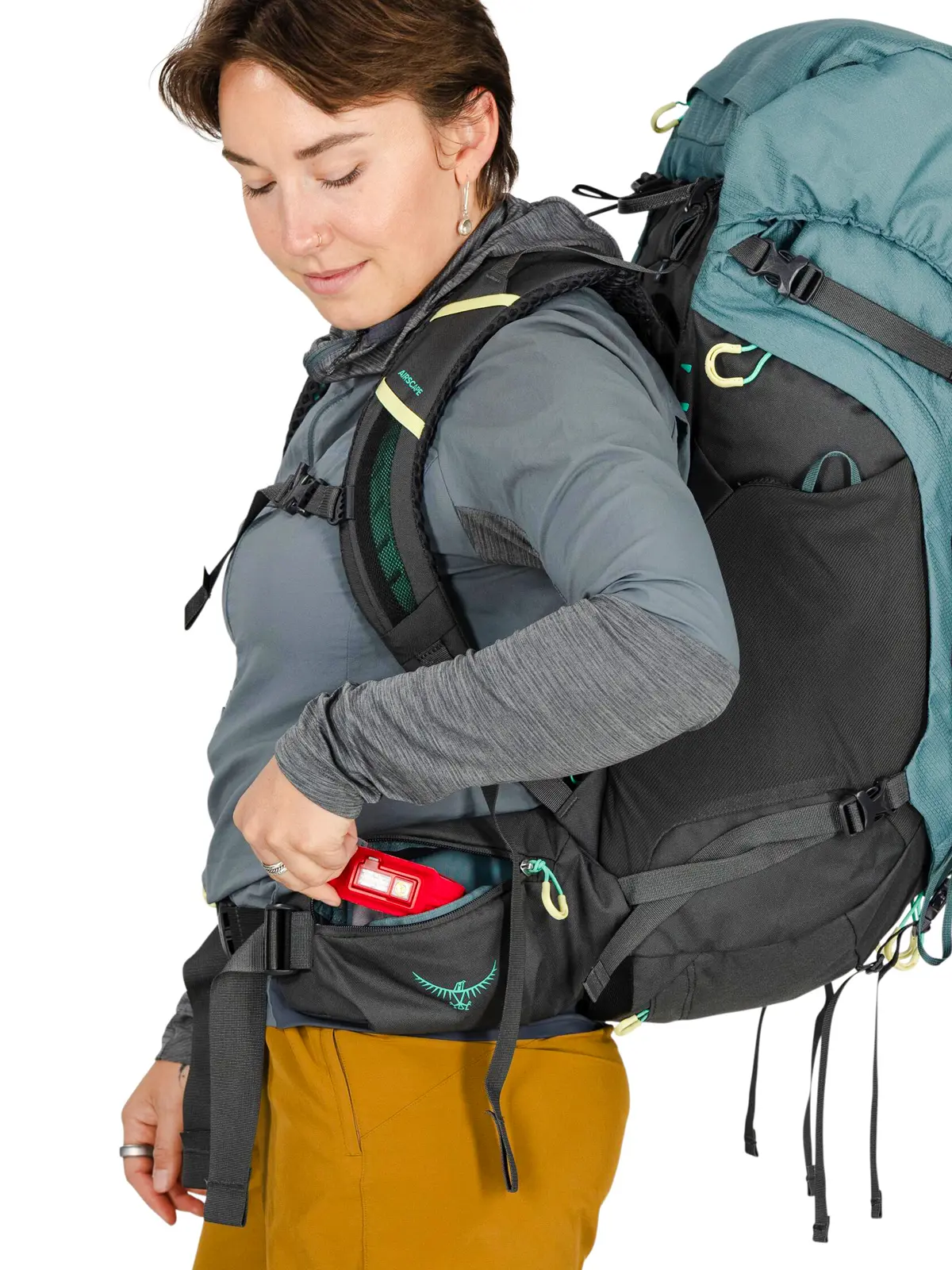 クッション性が高く身体にぴったりとフィットするエアスケープバックパネルが、快適でバランスの良い背負い心地を実現。背面長は調整が可能で、正確なフィット感を提供します。メイン荷室の上部にはトップリッドを備え、フロントの収納ポケットとヒップベルトポケットに必需品を収納できます。
