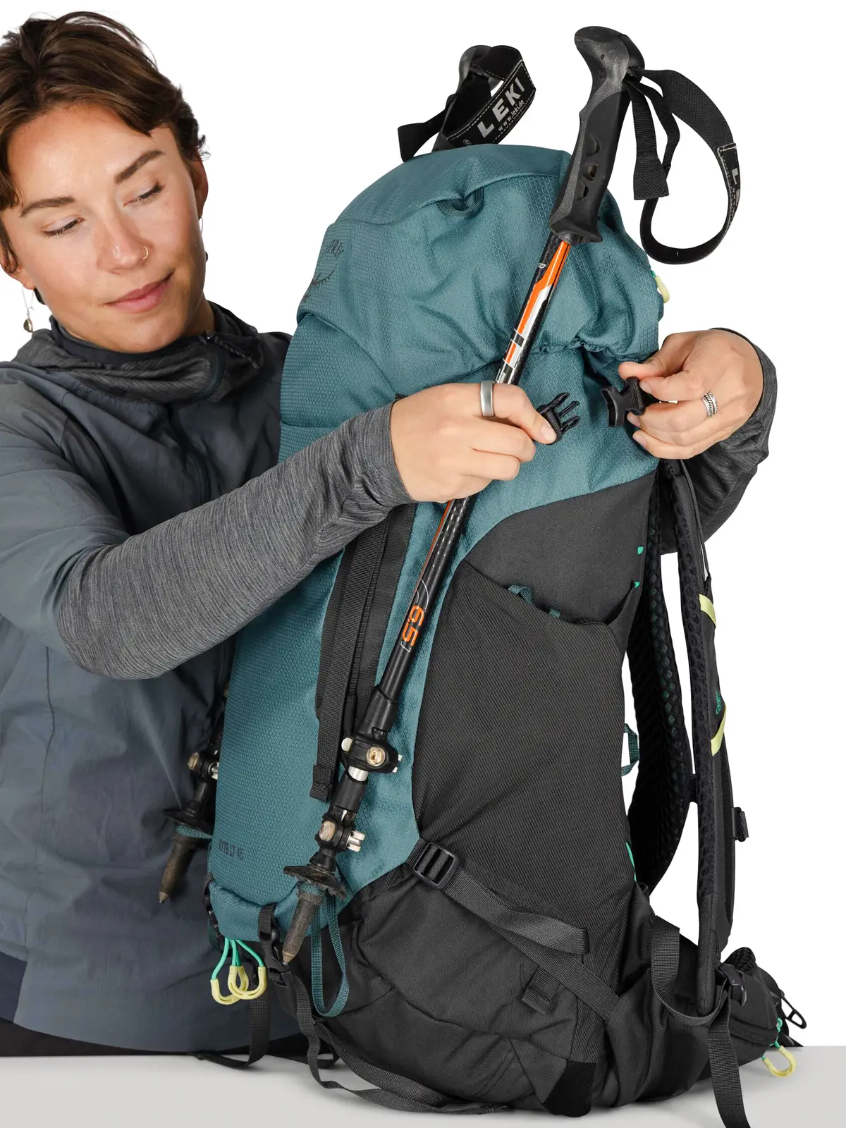 • アイスアックスやトレッキングポールを装着できるツールキャプチャーと上部サイドコンプレッションストラップ