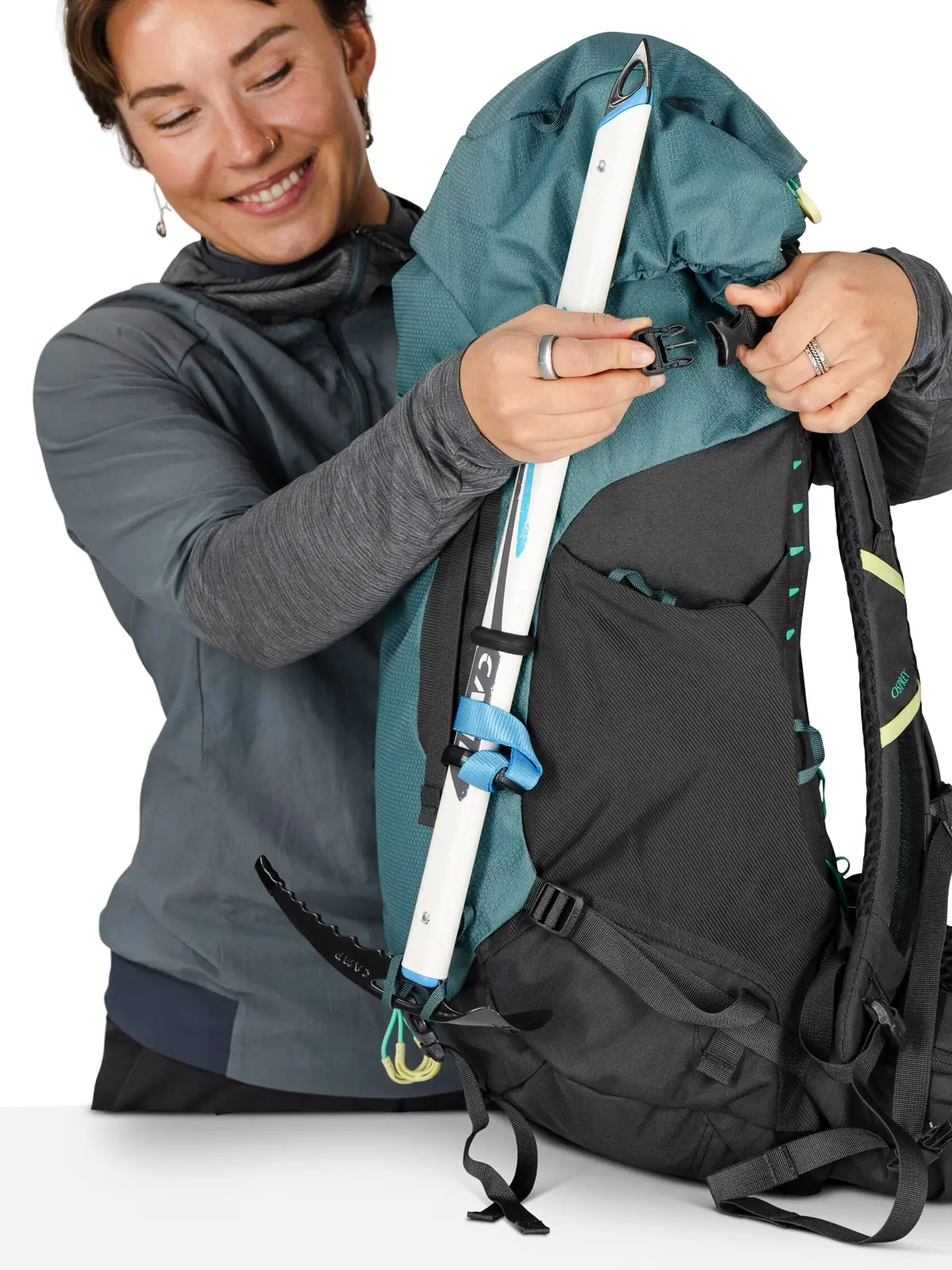 • アイスアックスやトレッキングポールを装着できるツールキャプチャーと上部サイドコンプレッションストラップ