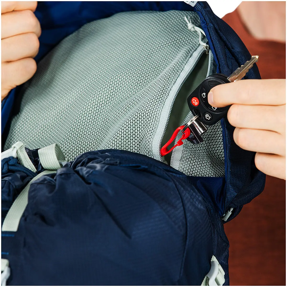 - トップポケットの裏にキークリップ付きメッシュポケット