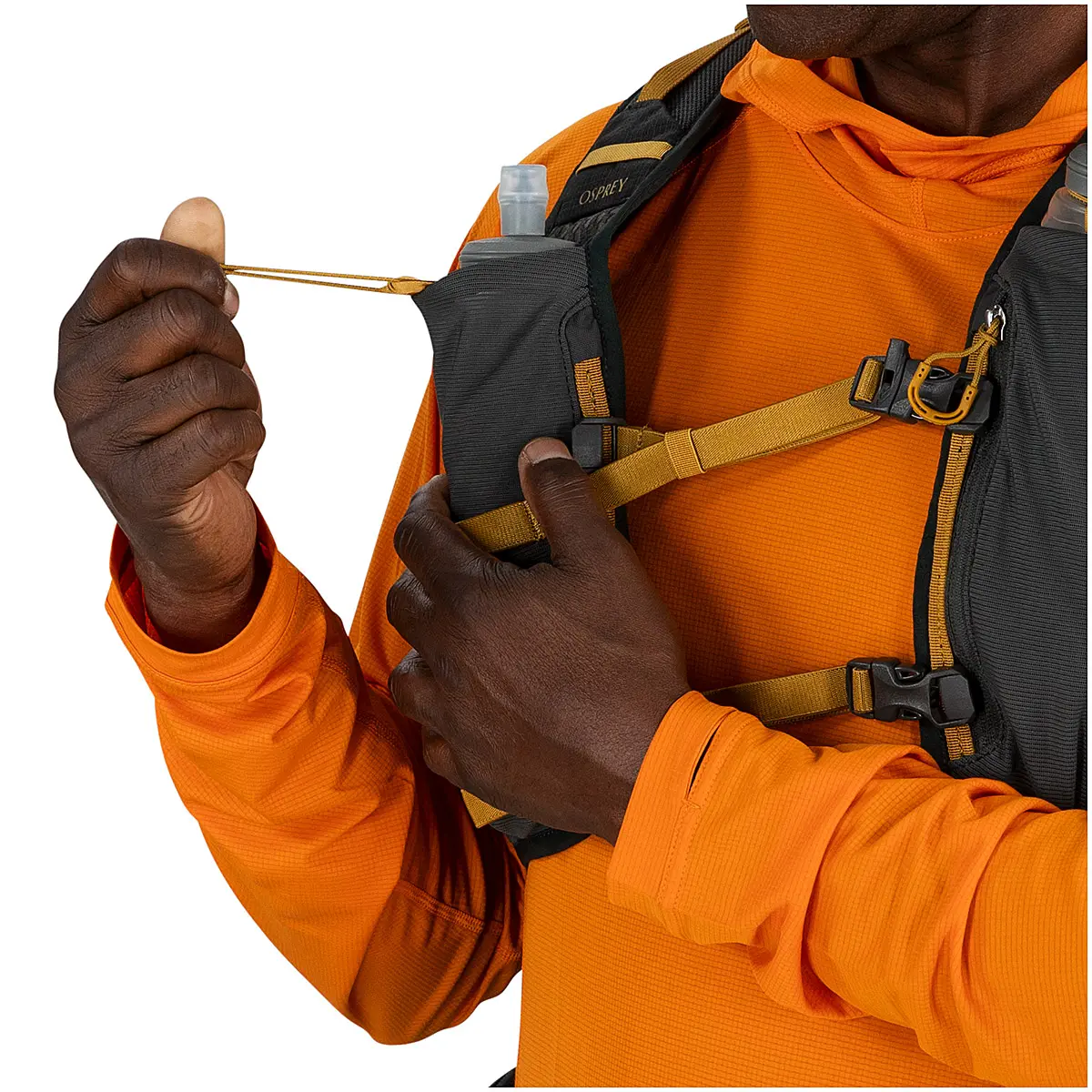 - 500mlソフトフラスク対応ポケット、大きめのジッパー付きポケット、小さめのドロップポケットを備えるショルダーハーネス