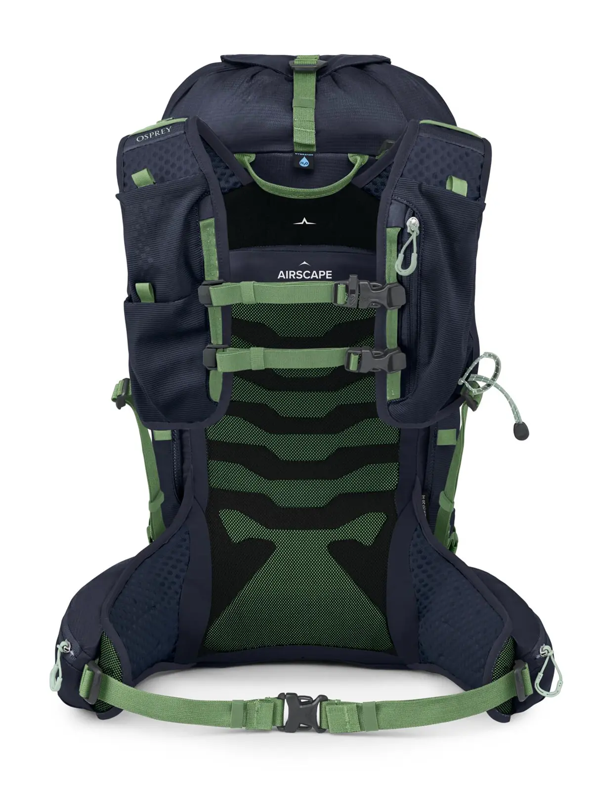 背面には運搬時の安定性と適度な通気性に優れるエアスケープバックパネルを採用。面ファスナーによる最大10cmの背面長調整が可能なほか、ロードリフターも備えており、荷重に合わせてフィットの微調整が可能です。バックパネルとシームレスに一体化された、柔軟性のあるヒップベルトが腰を包み込み、アクティブな身体の動きに対応します。