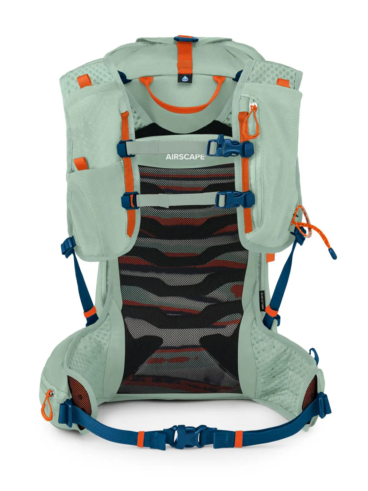 背面には運搬時の安定性と適度な通気性に優れるエアスケープバックパネルを採用。面ファスナーによる最大10cmの背面長調整が可能なほか、ロードリフターも備えており、荷重に合わせてフィットの微調整が可能です。バックパネルとシームレスに一体化された、柔軟性のあるヒップベルトが腰を包み込み、アクティブな身体の動きに対応します。
