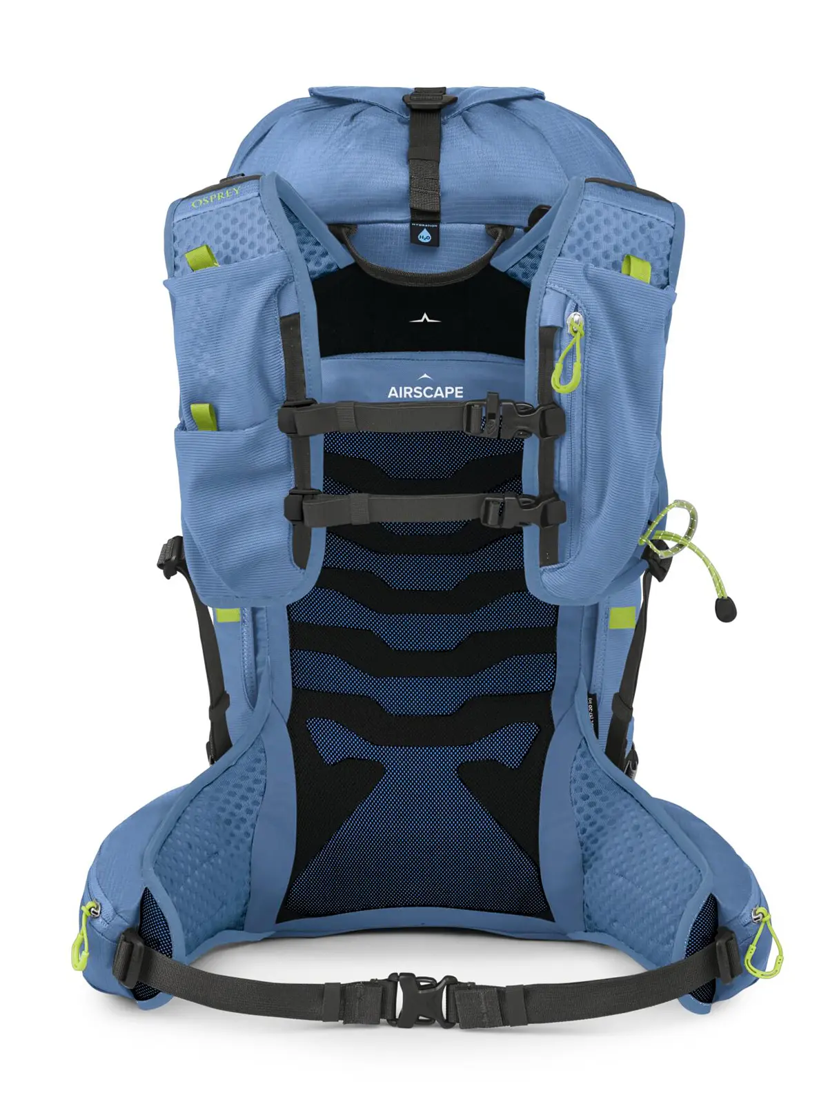 背面には運搬時の安定性と適度な通気性に優れるエアスケープバックパネルを採用。面ファスナーによる最大10cmの背面長調整が可能なほか、ロードリフターも備えており、荷重に合わせてフィットの微調整が可能です。バックパネルとシームレスに一体化された、柔軟性のあるヒップベルトが腰を包み込み、アクティブな身体の動きに対応します。