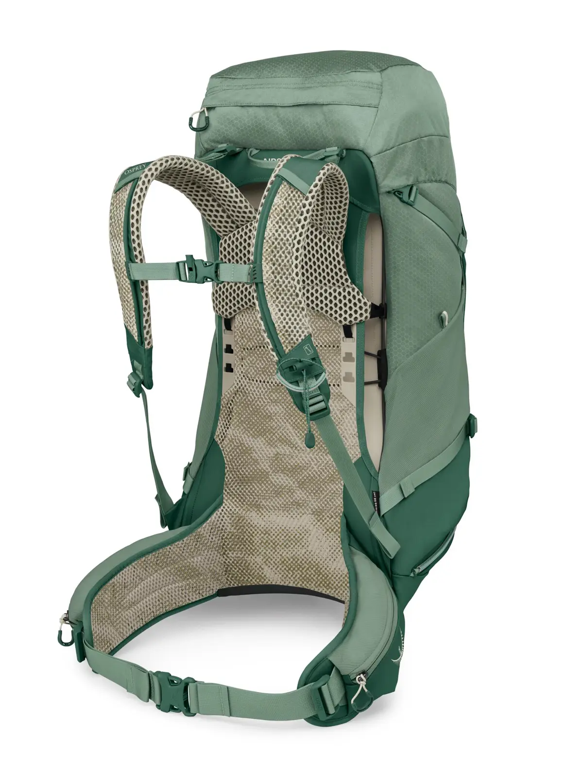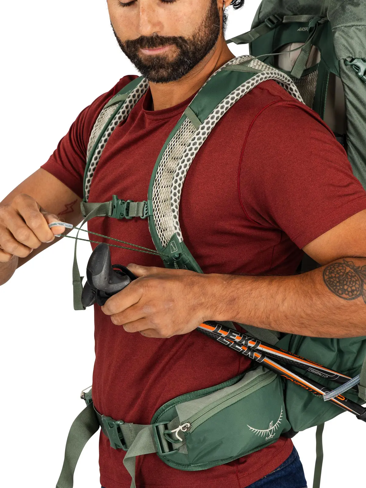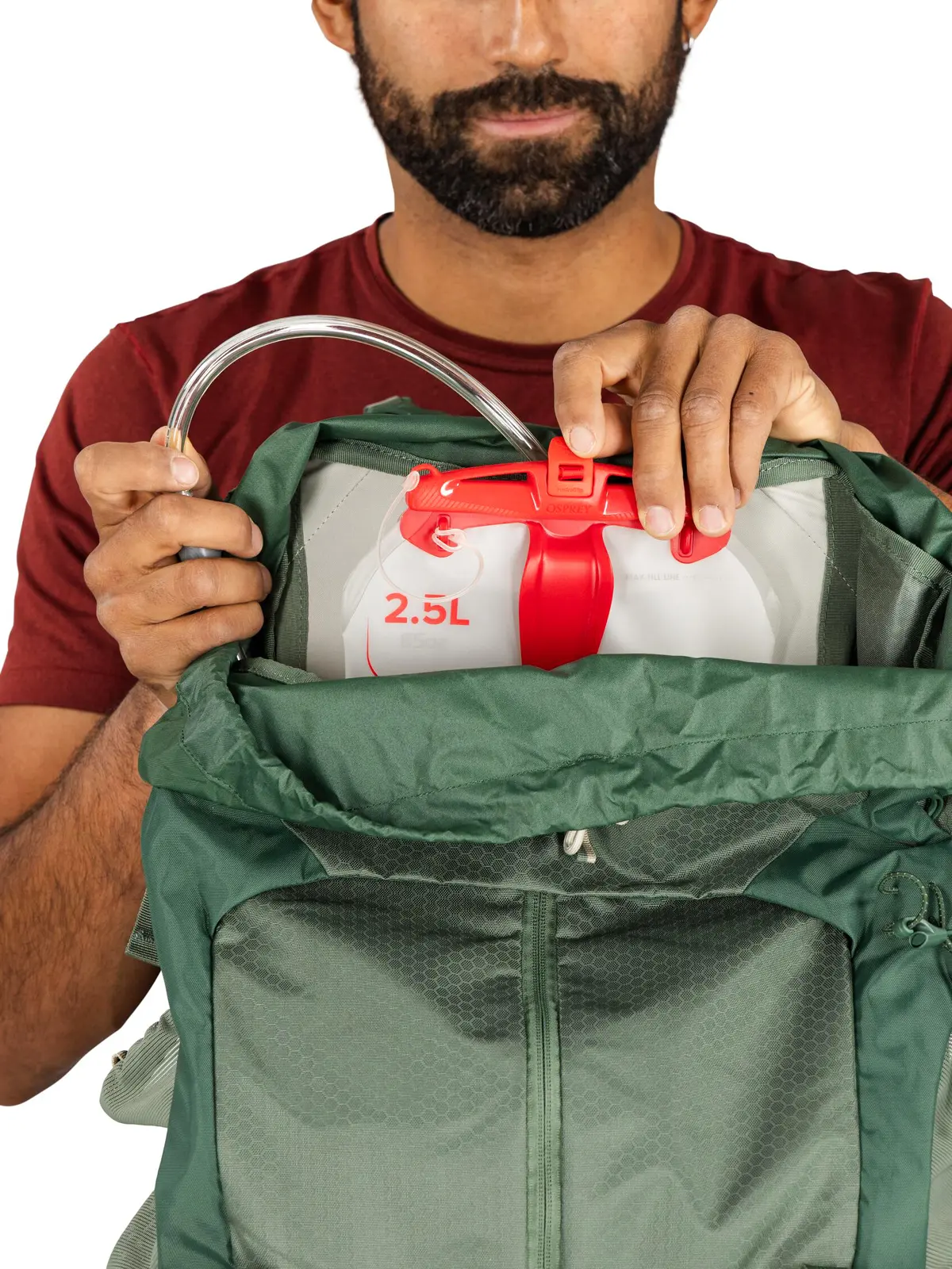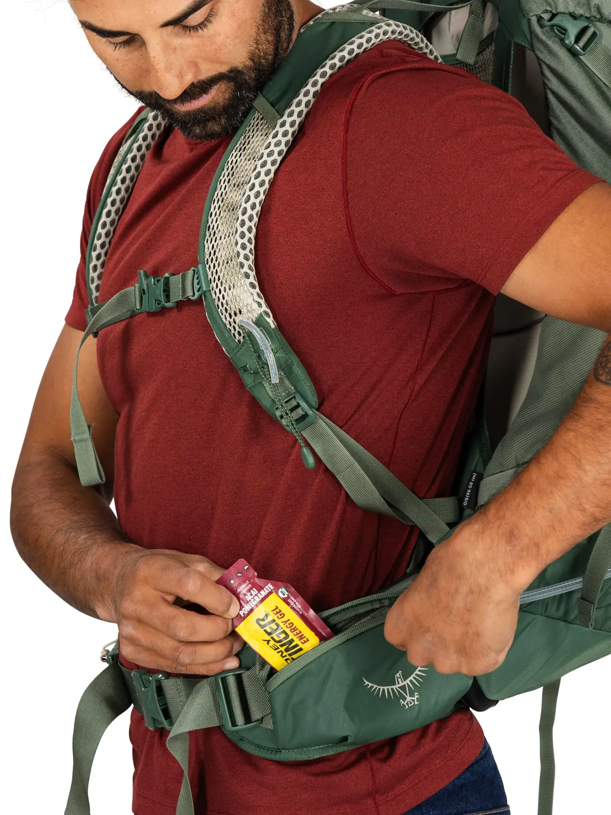 ムレやすい背面を風が抜ける造りで、暑い季節に特に快適なハイキングパック。男性の体格に合わせて調整可能で、余裕のある収納力を備え、1~2泊の山行に適しています。サイドの隠しジッパーポケットが収納力を高め、下部コンパートメントは仕切って2気室にできます。考え抜かれたポケット配置で小物も整理しやすく、必要に応じて付属のレインカバーを素早く取り付けできます。