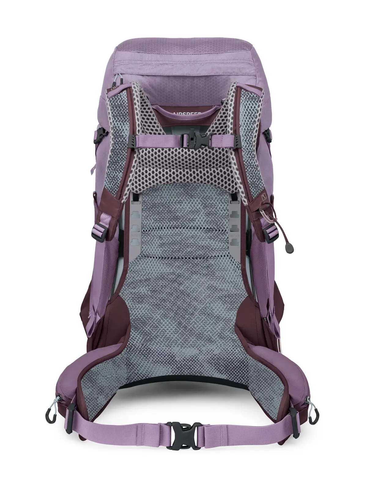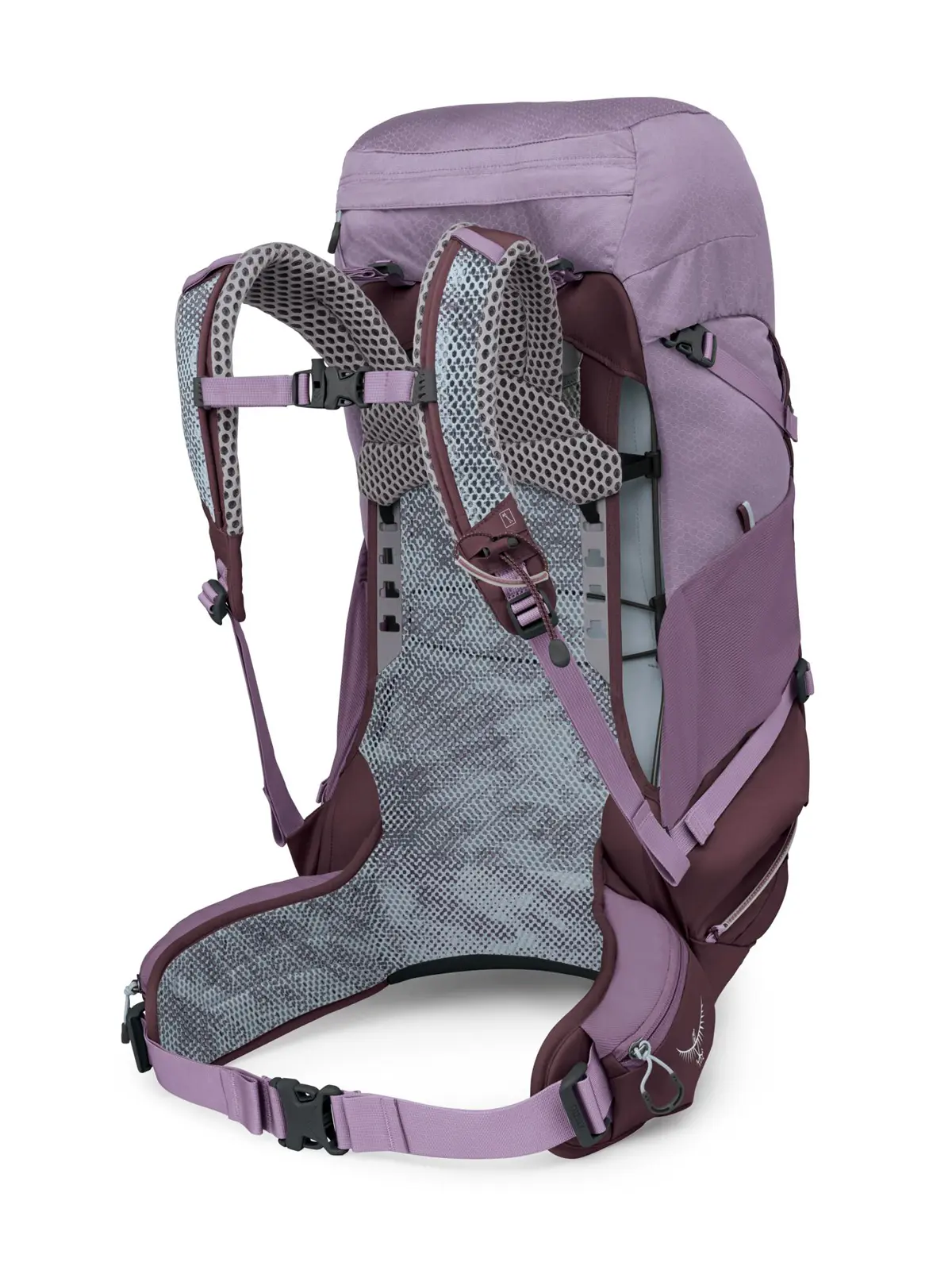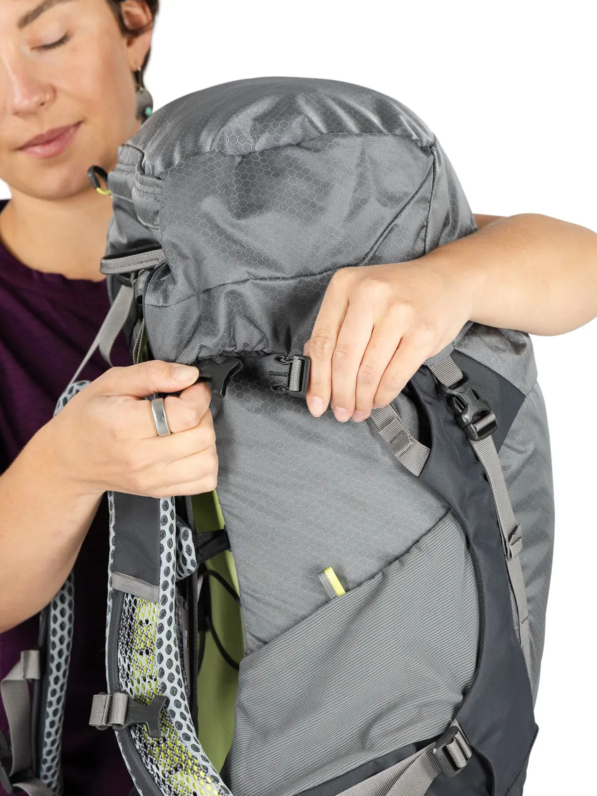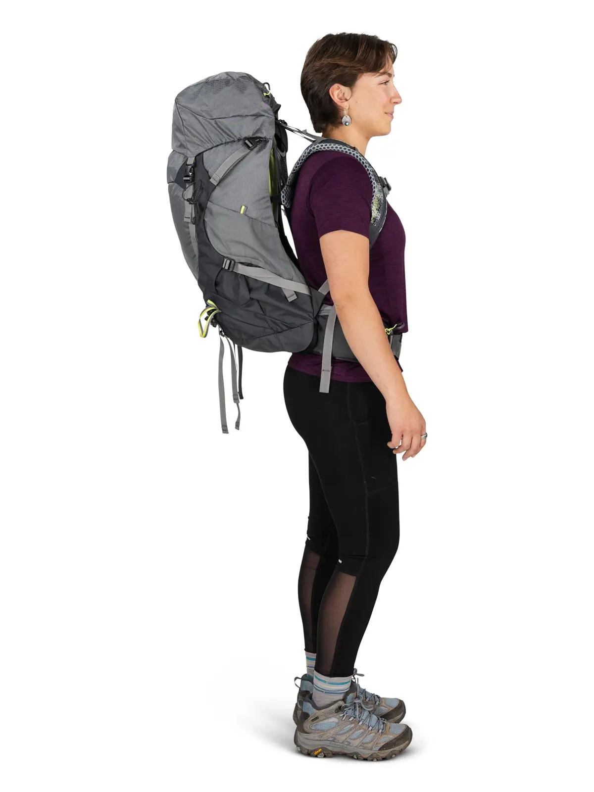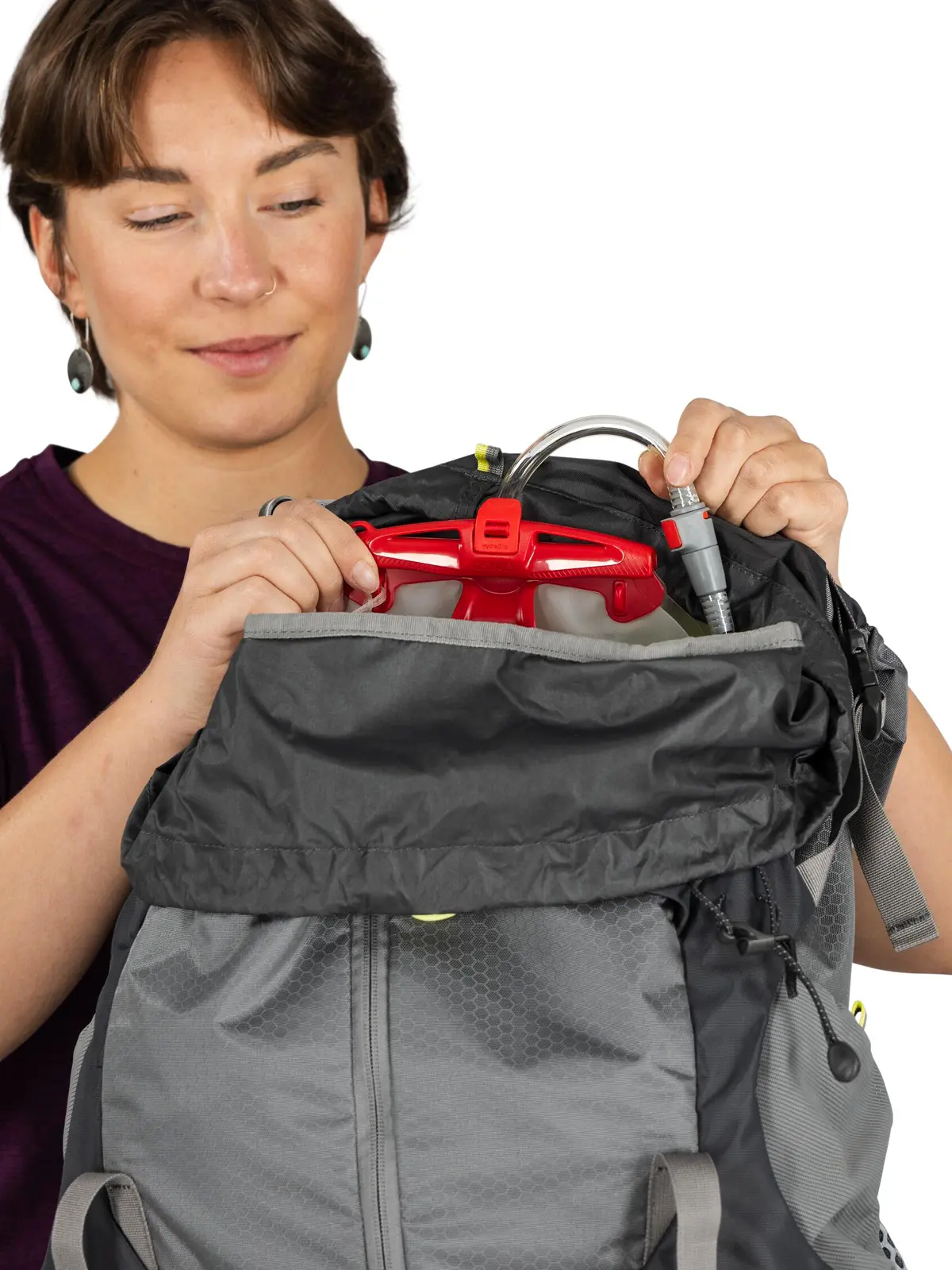 ムレやすい背面を風が抜ける造りで、暑い季節に特に快適なハイキングパック。女性の体格に合わせて調整可能で、余裕のある収納力を備え、日帰りハイクから1泊程度の山行まで対応します。下部コンパートメントは仕切って2気室にできます。考え抜かれたポケット配置で小物も整理しやすく、必要に応じて付属のレインカバーを素早く取り付けできます。