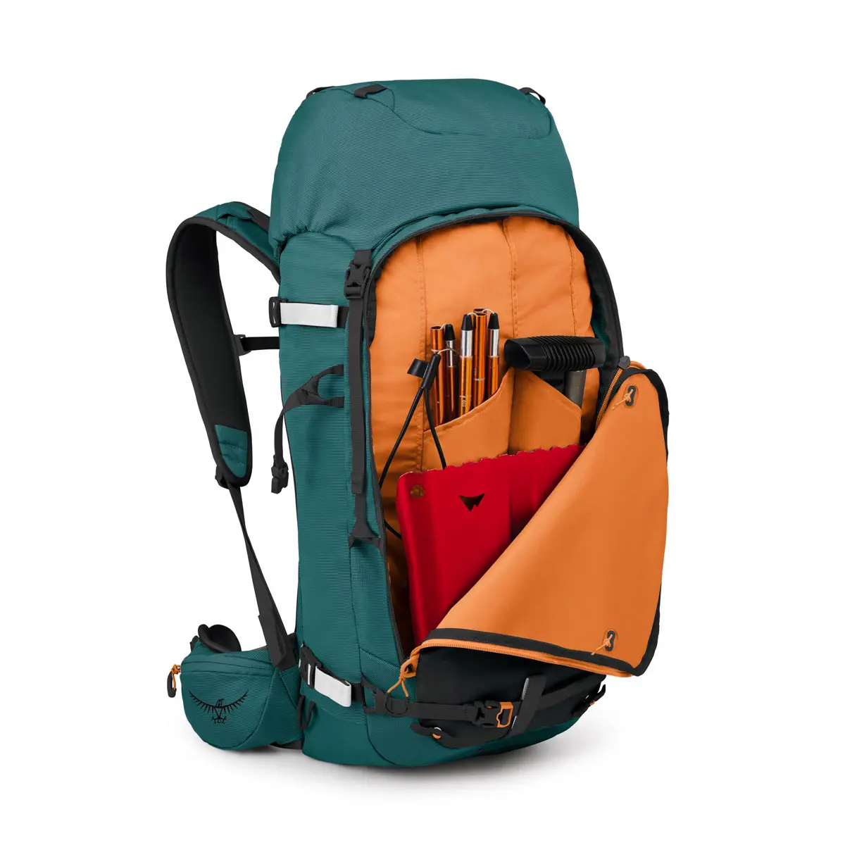 スキーは斜め掛けやAフレームでも装着可能、もちろんスノーボードも装備可能。アバランチポケットには目立つカラーのジッパーを採用し、緊急時でもアバランチギアへの直感的なアクセスが可能です。ヘルメットキャリーやスキー/スノーボードアタッチメントポイントなど、雪山に特化した機能を備えています。