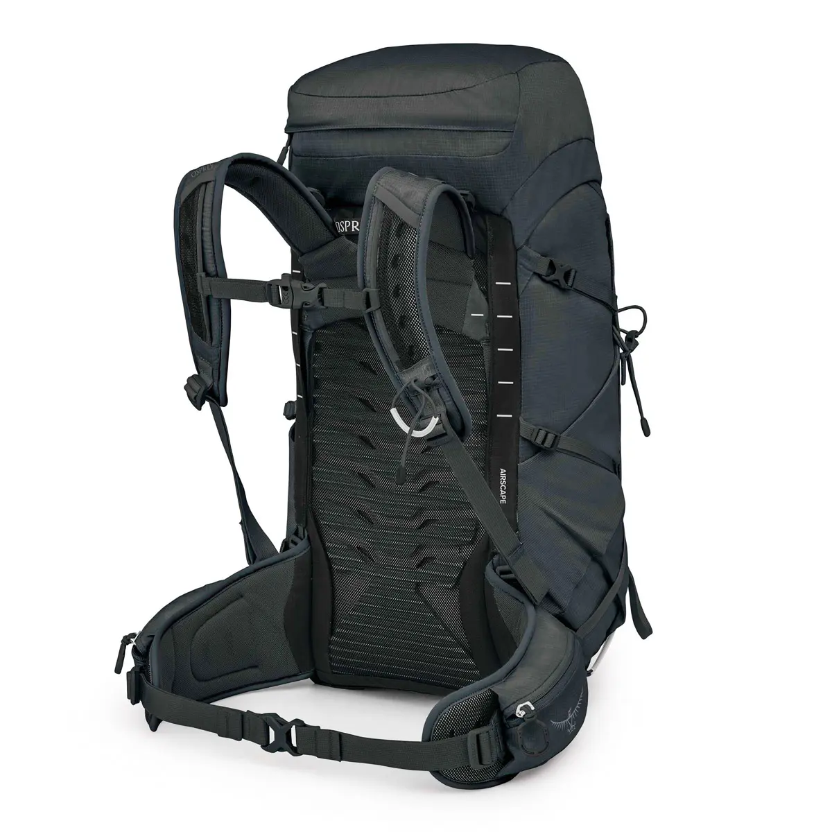 固定式の雨蓋を備えたトップローディング型で、豊富なポケットやアイスツールループのほか、行動中にトレッキングポールをパックに一時固定できる、オスプレー独自のストウオンザゴー機能を備えています。