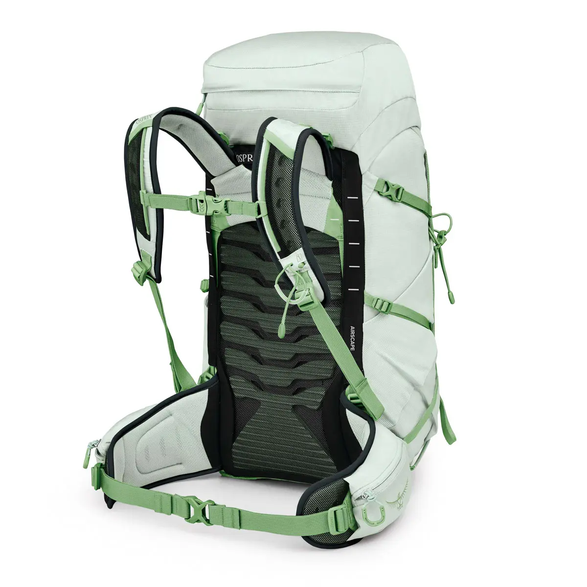 固定式の雨蓋を備えたトップローディング型で、豊富なポケットやアイスツールループのほか、行動中にトレッキングポールをパックに一時固定できる、オスプレー独自のストウオンザゴー機能を備えています。