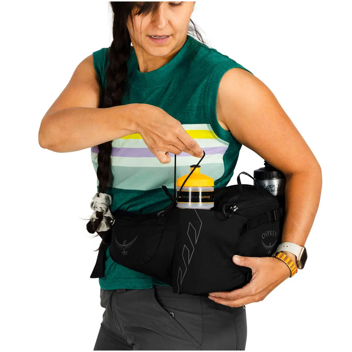 左右に備えられたボトルスリーブはバンジーコードが付属しており、ダイナミックな動きでも安定してボトルを持ち運べます。コンプレッションストラップは荷物が動くのを抑え、レインジャケットなどを外付けするのに役立ちます。