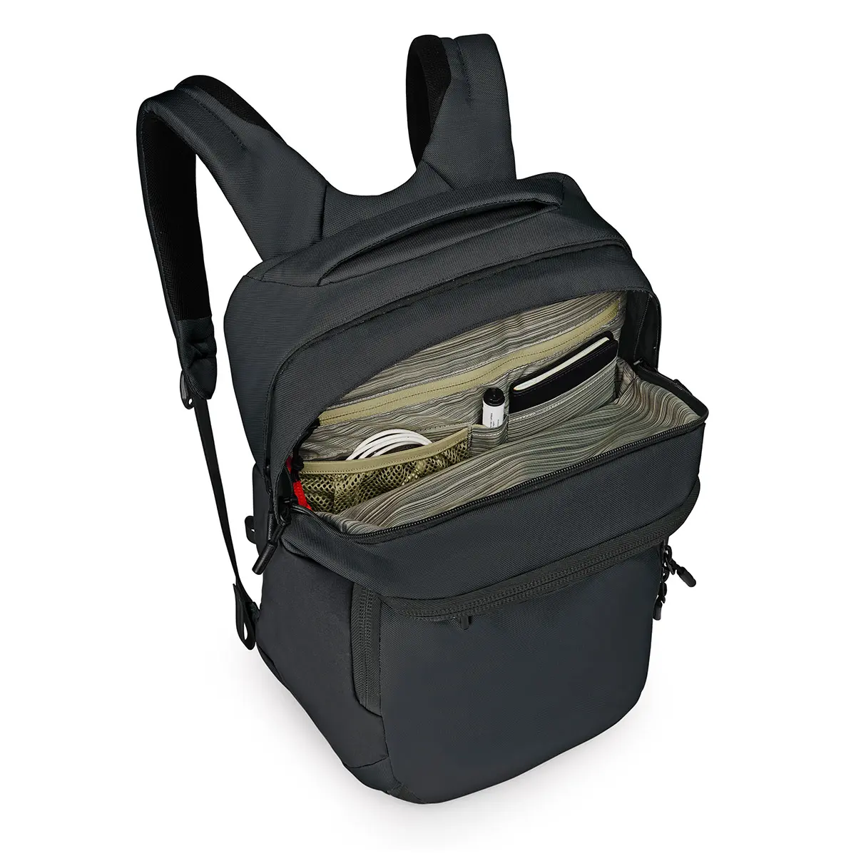 普段使いはもちろん、ビジネスシーンや出張にも使える汎用性の高いバックパック。背面はエアスピードと呼ばれる通気性の高いメッシュ構造を採用。パック背面周囲に内蔵されたワイヤーにピンと貼られたメッシュ地が背中とパックの間に空間を生み、空気の通り道をつくることで快適な背負い心地を実現しています。立体的なフレームはパック下部にも内蔵されており、床においてもパックがしっかりと自立します。自立時にはPCスリーブが床に触れない構造のため、PCを傷つける心配もありません。カフェでの作業や電車など、スペースのない場所でも床に置いておくことができます。メインの荷室に加え、ノートPCスリーブや書類やペン等の文房具を整理して収納できるポケットを多数装備。ビジネスシーンにもなじむ、ミニマルでクリーンなシルエットです。