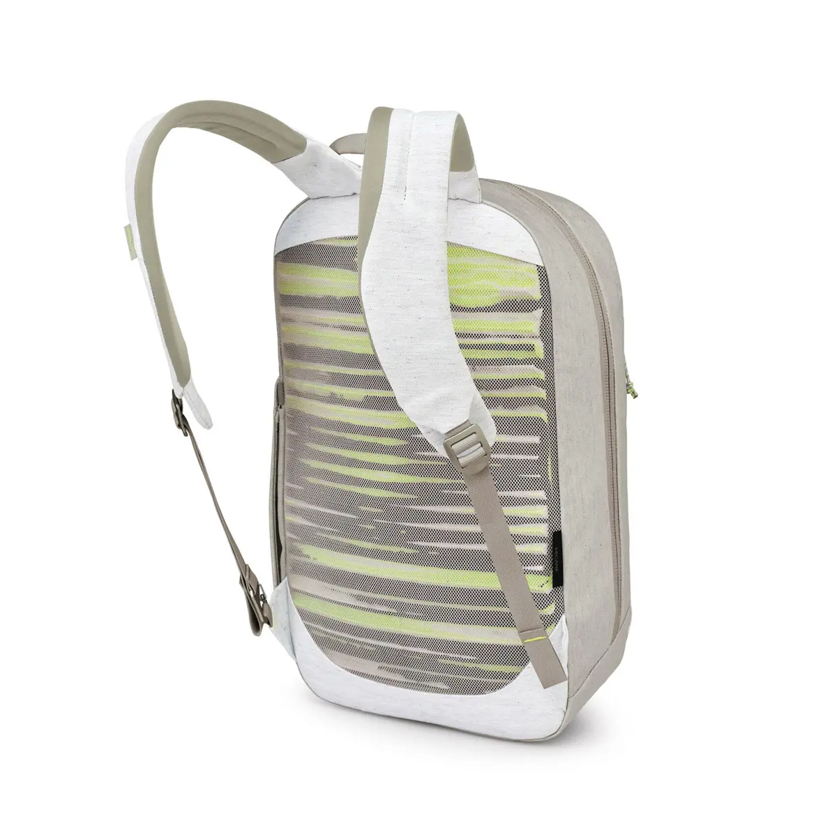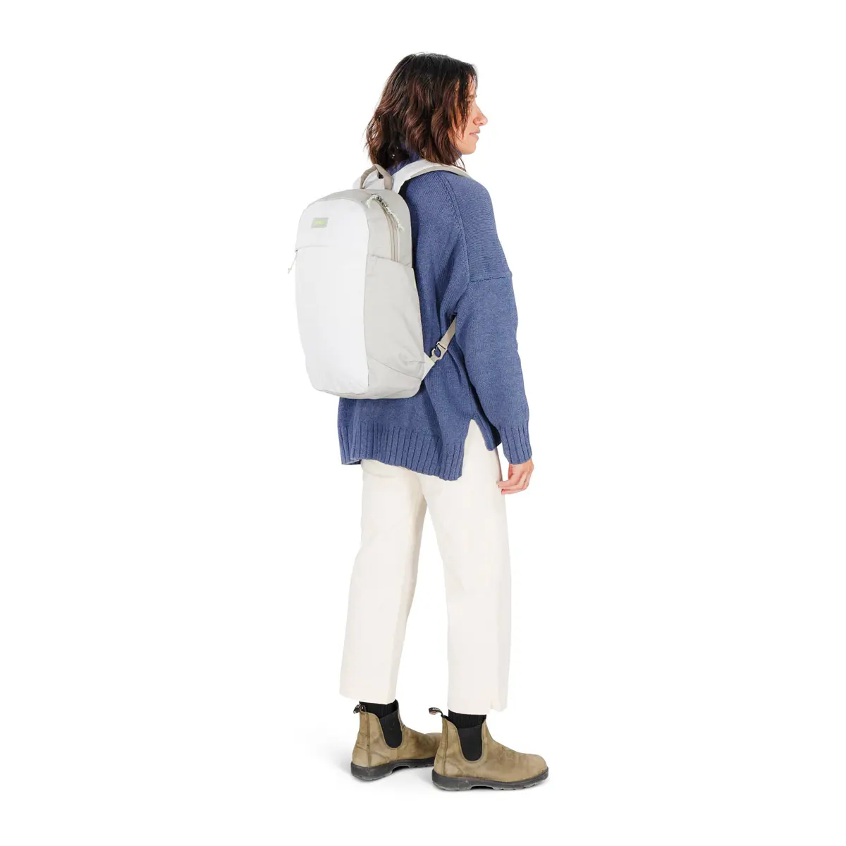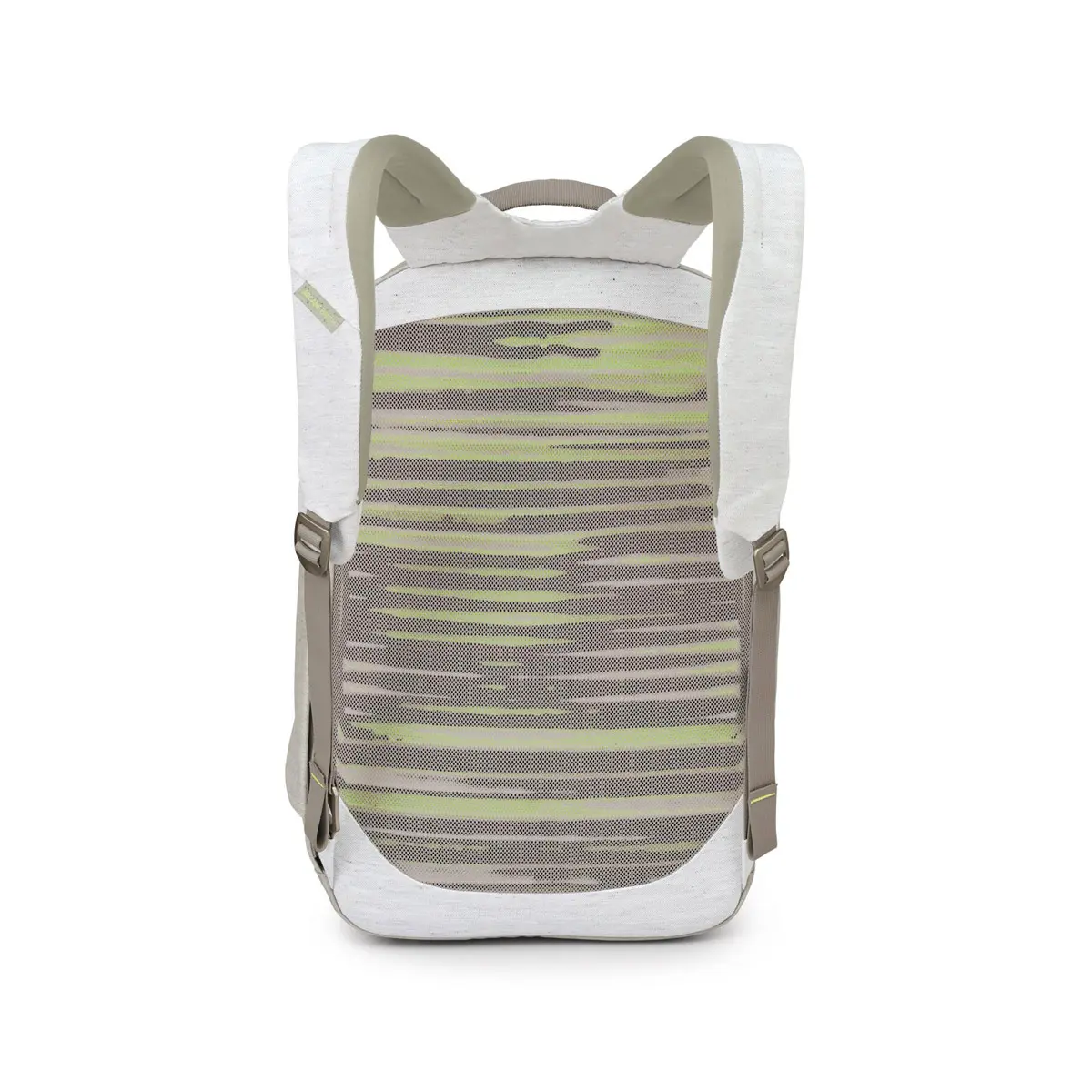 オスプレーの工場の裁断くずを再利用して開発された新素材「ReComp」は、通常は埋立地に廃棄される工場の廃棄物30%を再利用して製造されています。さらに、85%リサイクルされたEVAフォーム、100%リサイクルされたラベルとジッパープルを使用しています。また、水とエネルギーの節約のために染色を最小限に抑え、リサイクル素材をブレンドした独自の質感と色合いにより、一つひとつの風合いや背面パネルの柄が異なるデザインです。