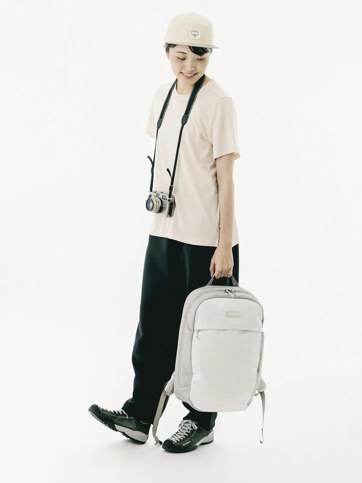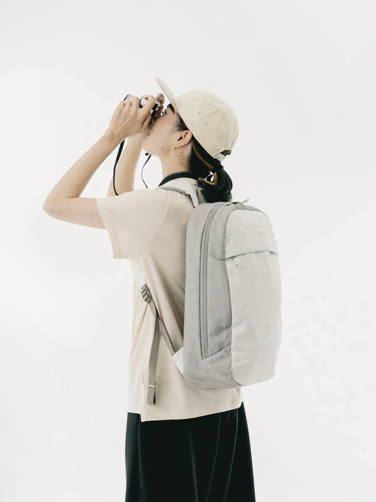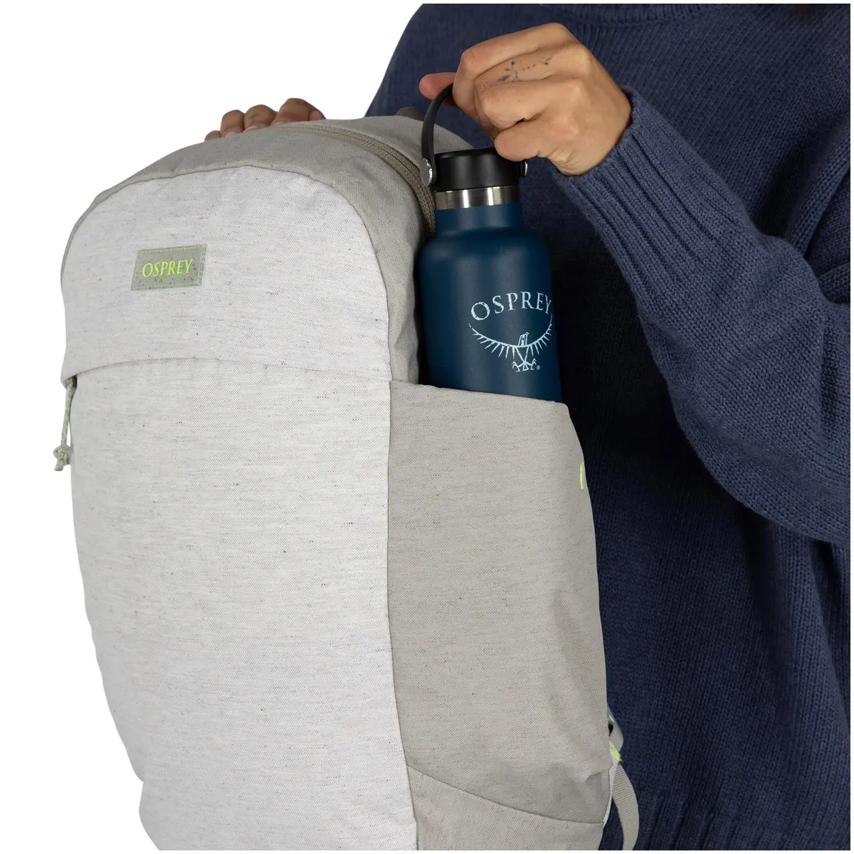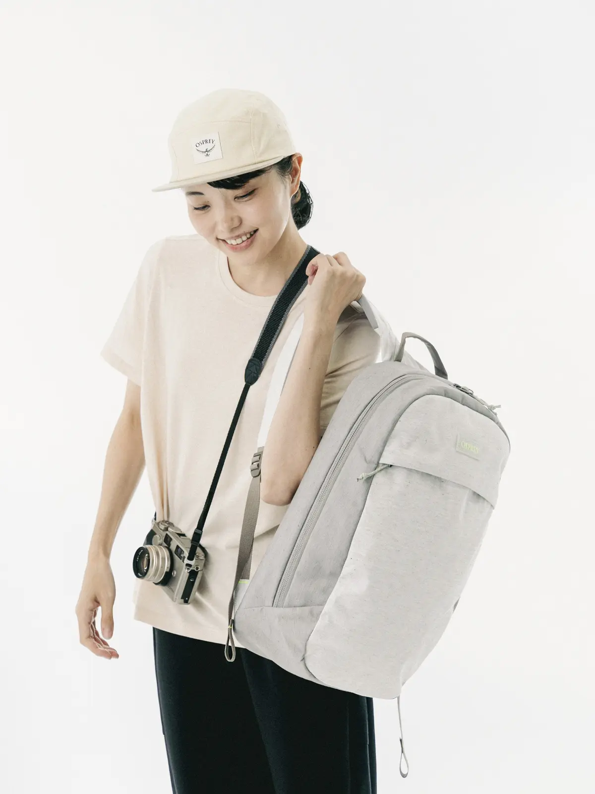 オスプレーの工場の裁断くずを再利用して開発された新素材「ReComp」は、通常は埋立地に廃棄される工場の廃棄物30%を再利用して製造されています。さらに、85%リサイクルされたEVAフォーム、100%リサイクルされたラベルとジッパープルを使用しています。また、水とエネルギーの節約のために染色を最小限に抑え、リサイクル素材をブレンドした独自の質感と色合いにより、一つひとつの風合いや背面パネルの柄が異なるデザインです。