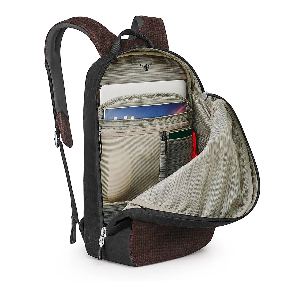 J字型に開くフロントパネルのデイパック。天然ウールとワックス加工キャンバスのクラシカルなテキスタイルを主役に据えた限定モデルです。16インチのラップトップも収納できる容量があります。整理整頓に便利な内部ジッパーポケットに加え、キーフック、薄型のウォーターボトルポケット、持ち物を固定する内蔵セルフロックフックなど、機能に富んだパックです。