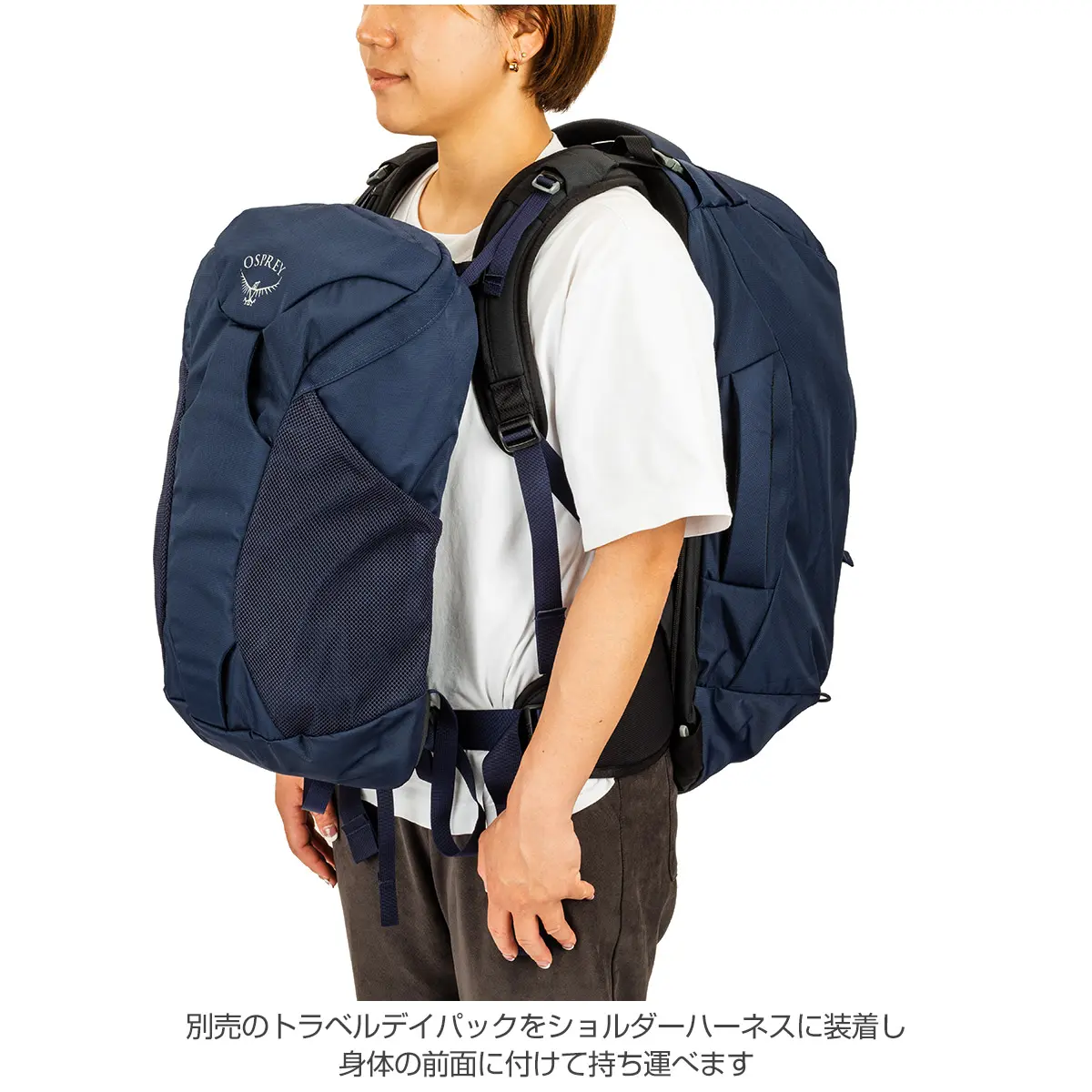 - ファーポイント/フェアビュー トラベルデイパックをショルダーハーネスに装着し、身体の前面に付けて持ち運べます