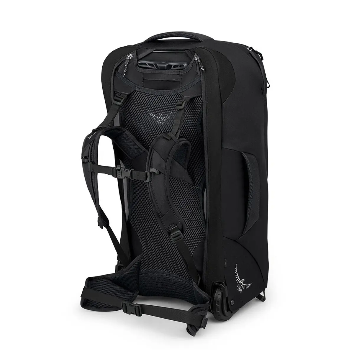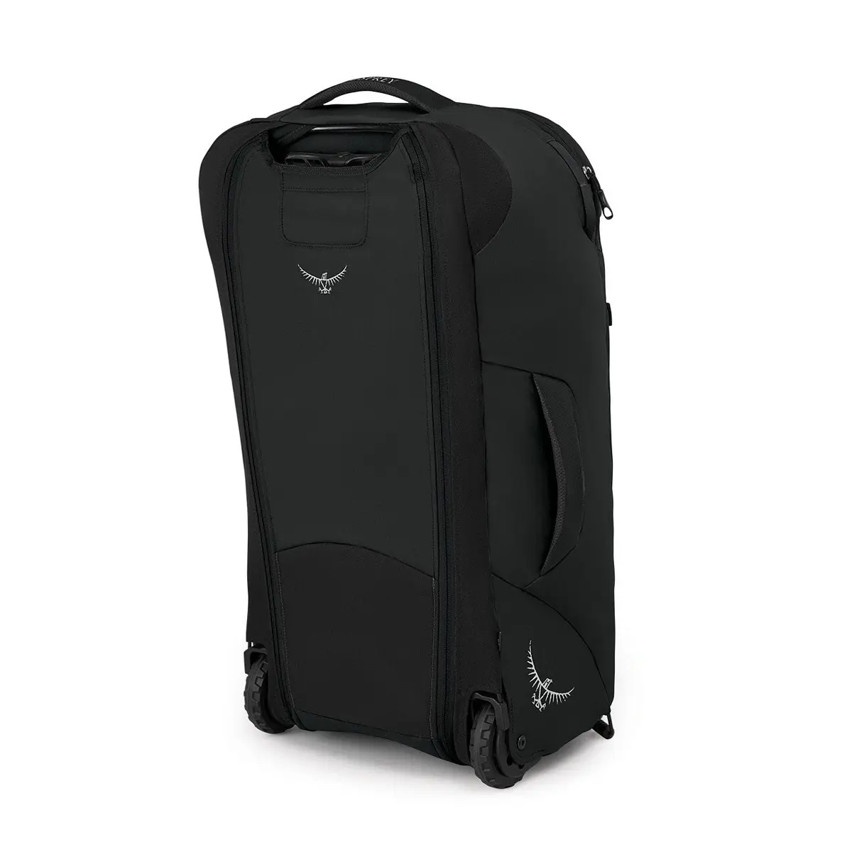 背負うと転がす、2つの運び方ができるトラベルパック。背負う場合は背面のジッパーは開けショルダーハーネスと折り紙式に収納されたヒップベルトを展開。転がす場合は背面上部のハンドルバーを引き出します。メインコンパートメントのジッパーはロッカブル仕様。